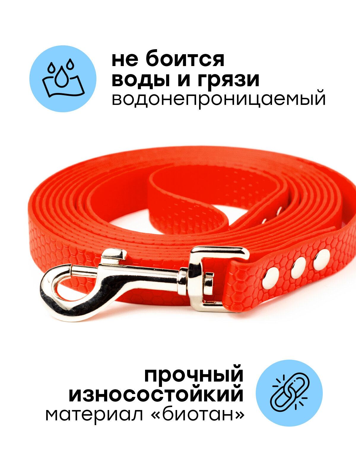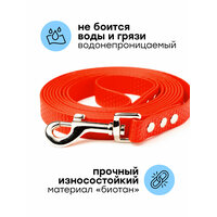 Поводок изготовлен из биотана. BioThane – покрытая полимерной оболочкой (ПВХ) синтетическая стропа. Гибкая внутренняя основа обеспечивает высокую прочность, а внешний прорезиненный слой – надежную защиту от воздействия воды и грязи. Внешний слой с уникальной приятной на ощупь фактурой, препятствующей скольжению в руке.