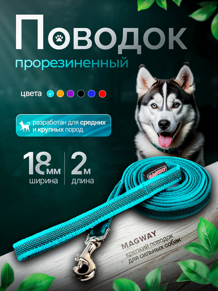 Купить Поводок прорезиненный нескользящий MagWay, для собак средних и крупных пород, ширина 18мм, цвет бирюзовый, длина 2 метра с доставкой по всей России.