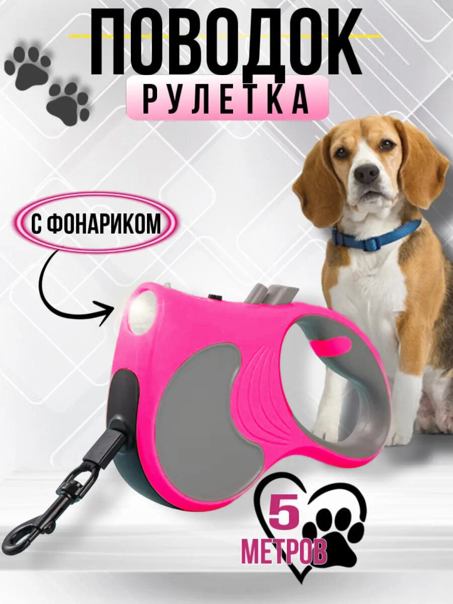 Поводок для мелких пород собак с фонариком и рулетка 5м - это незаменимый аксессуар для владельцев маленьких и средних пород собак.