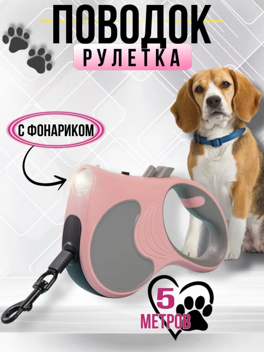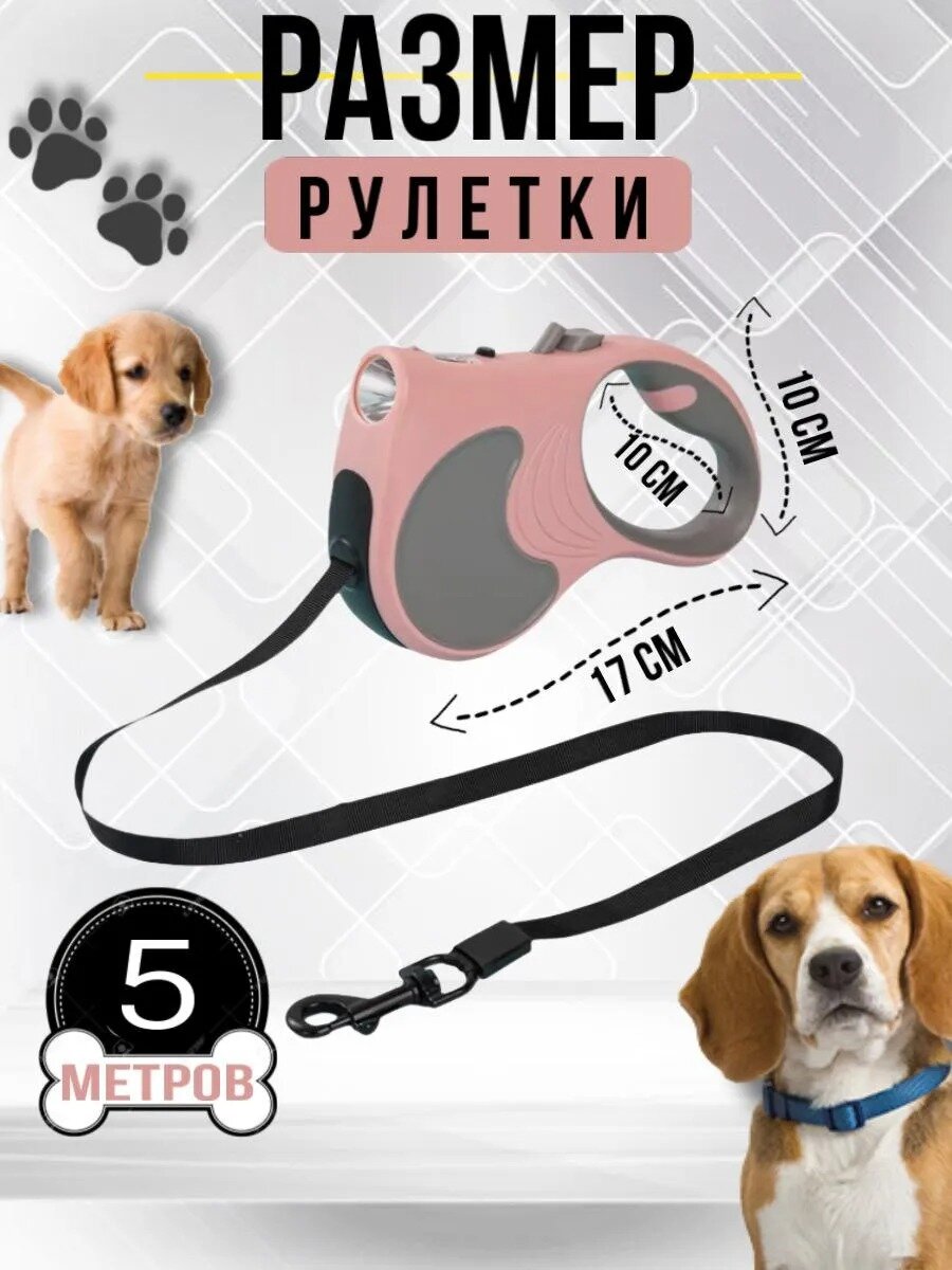 Поводок для мелких пород собак с фонариком и рулетка 5м - это незаменимый аксессуар для владельцев маленьких и средних пород собак.