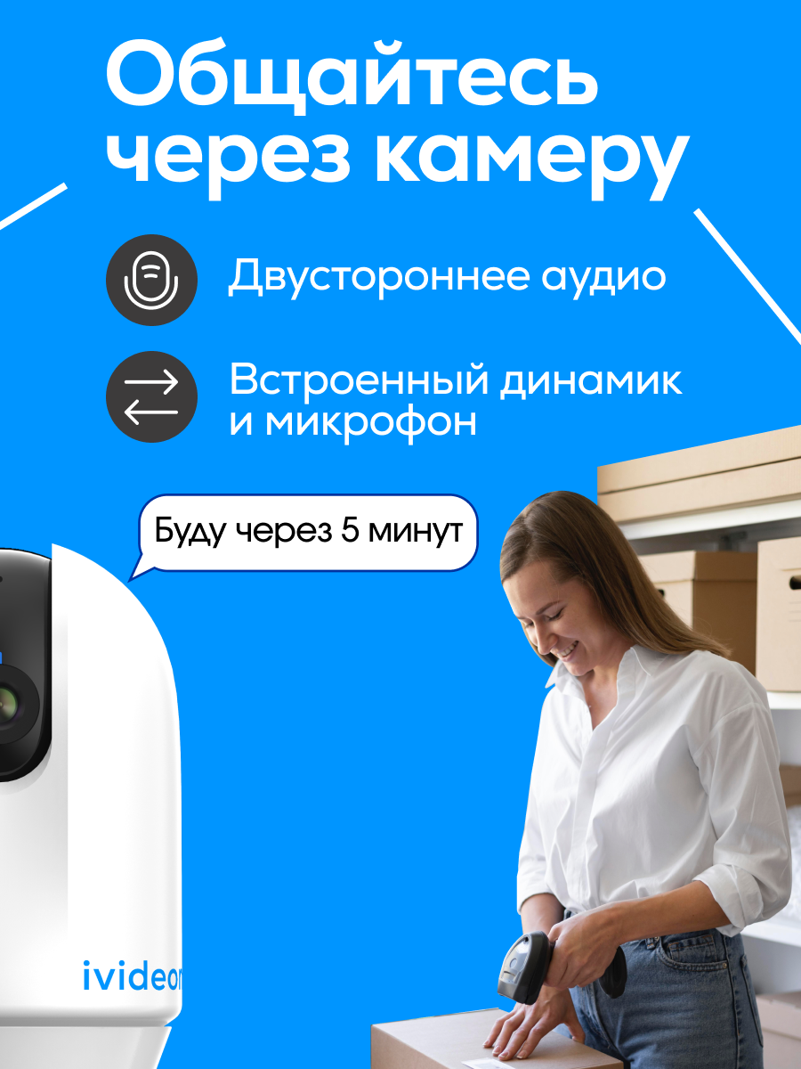 Ivideon Leo 360 — поворотная Wi-Fi-камера для ПВЗ Компактная настольная камера с широким обзором и облачными функциями Ivideon. Отлично подходит для контроля в пункте выдачи заказов (ПВЗ) с соблюдением требований маркетплейсов: постоянная запись, хранение в облаке до 90 дней, удалённый доступ, трансляция по ссылке, экспорт архива в MP4. — Снимает в Full HD (1920×1080) при 20 кадрах в секунду — Поворотный механизм обеспечивает полный охват помещения — удобно для обзора всей площади ПВЗ — Объектив 3.6 мм и матрица 1/2.9" Progressive Scan CMOS обеспечивают угол обзора 85° — Инфракрасная подсветка до 10 м — камера видит даже в темноте — Встроенный микрофон позволяет вести прослушивание в реальном времени — Поддержка microSD до 128 ГБ — локальное хранение при необходимости — Подключение по Wi-Fi (2.4 ГГц), питание через microUSB или Type-C (блок питания в комплекте) — Поддерживает облачные функции Ivideon: удалённая настройка, детекция движения, архив до 90 дней, мобильный доступ — Поддержка видеосжатия H.264 и технология DWDR для улучшения изображения — Простая установка — подходит для размещения на столе или полке, настройка за 5 минут Габариты: 96×64×64 мм, вес: 160 г. Рабочая температура: от -20 до +50°C. Гарантия: 12 месяцев. Услуга облачного сервиса оказывается АО "Мобильные Видеорешения".