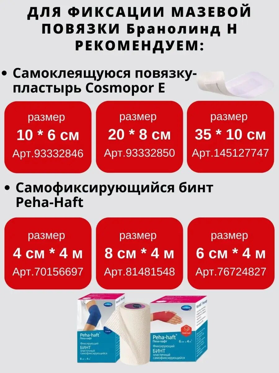 Повязка на рану Бранолинд Н с мазью ранозаживляющей компании Хартманн выпускается в виде хлопковой крупноячеистой ткани, которая пропитана специальным раствором способствующем быстрому восстановлению. Натуральный материал изделия с крупными ячейками хорошо пропускает воздух и раневое отделяемое (экссудат), не мешая его оттоку от пораженных участков эпидермиса. Стерильная антисептическая повязка служит для заживления язв и волдырей, рассечений, восстанавливает кожные покровы на тканевом уровне, предотвращая развитие вторичной инфекции. Перуанский бальзам, который является основным компонентом мазевого состава, обладает антибактериальными и противовоспалительными свойствами. Медицинское полотно показано при гнойных и рваных ранах, пролежнях, порезах, ссадинах, ушибах, ожогах, после пересадки кожи. Высокая эффективность (тесный контакт с кожей) замечается не только при терапии поверхностных, но и при лечении глубоких повреждений. Очень экономична в применении, так как вырезается по размеру (остальное нужно хранить в холодильнике). Смена осуществляется один раз в три дня, если пораженная область не мокнет. Будет незаменимым помощником в каждой домашней аптечке, на даче, в поездках на море, в путешествиях, в походах круглый год. Станет отличным средством на кухне для хозяек или профессиональных поваров при травмах при приготовлении пищи. Произведена на заводе Hartmann в России по немецким стандартам.