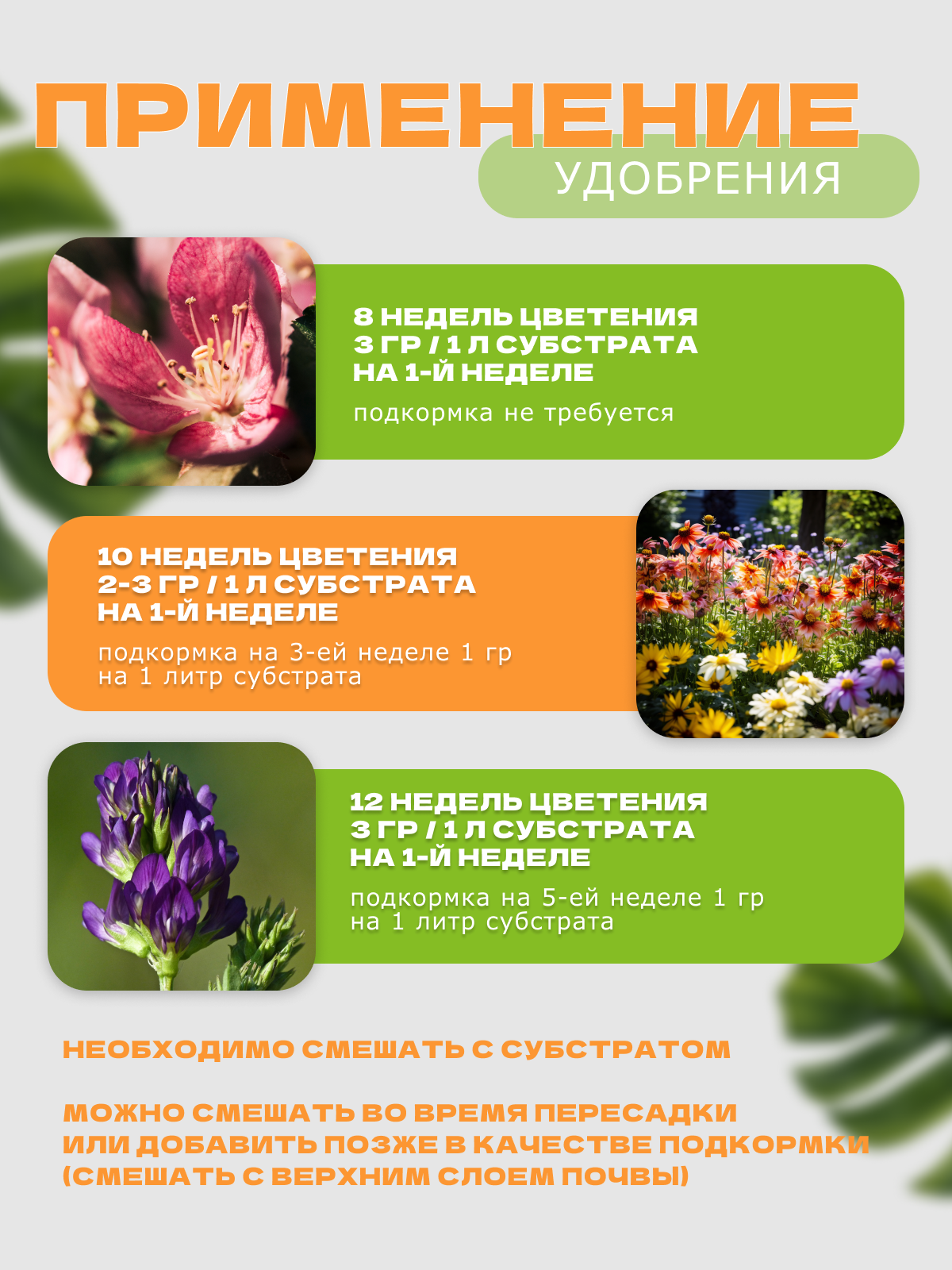 Необходимые питательные вещества обеспечивают отличное цветение и производство фруктов, они легко доступны для растений и медленно высвобождаются, чтобы обеспечить все питательные вещества в течение 8 недель.