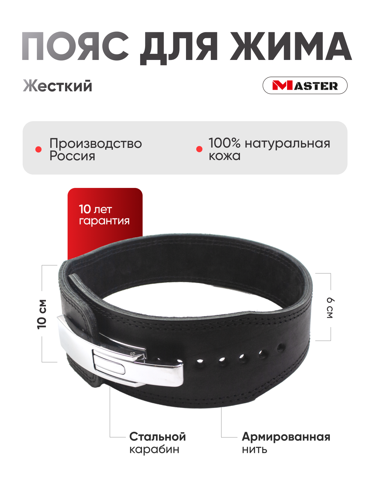 Особо прочный пояс MASTER для жима 6см со стальным карабином. Благодаря своей ширине идеально подходит для выполнения жима штанги лежа. Изготовлен из натуральной кожи, имеет ширину спереди 10см, благодаря чему не врезается в живот и лучше держит спину, при выполнении жима лежа. Прошивка высокопрочной нитью, 3 слоя натуральной кожи и стальной карабин делают ремень готовым к любым нагрузкам. Полностью соответствует требованиями, предъявляемым к поясам на соревнованиях по пауэрлифтингу в любой федерации. Для более точного подбора размера измерьте объем талии. S: 62-82 см, M: 72-92 см, L: 82-102 см, XL: 92-112 см, XXL: 102-122 см.
