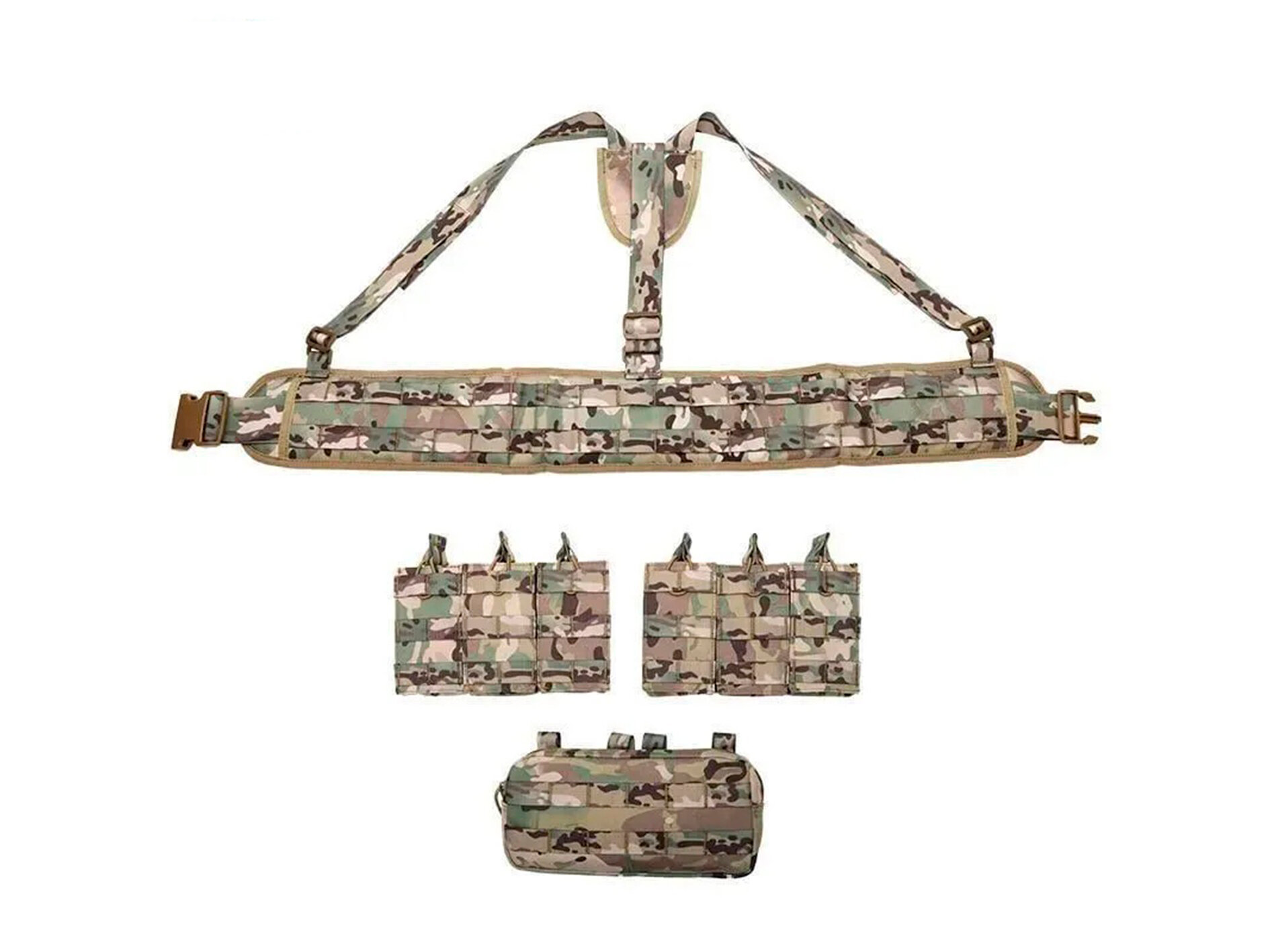 Длина ремня 95-125 см Регулируемые лямки Съёмные подсумки Molle Всего 7 подсумков. 1 утилитарный 6 по 3 с каждой стороны под рожки/магазины.