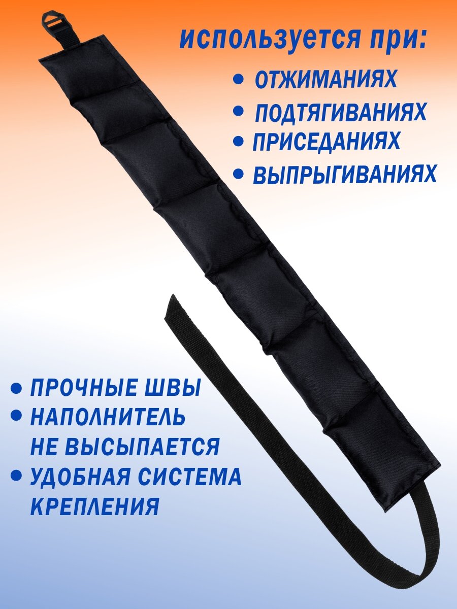 Перестали чувствовать удовлетворение от тренировок? Хотите увеличить выносливость? Хотите почувствовать себя еще сильнее? Хотите получить импульс от ощущения, что прогресс есть, что вы не стоите на месте, не теряете форму? Если ВАМ ЭТО нужно - то именно для вас пояс утяжелитель - это специальная манжета из прочной и непромокаемой ткани с сыпучим наполнителем, которая крепится на талии. Пояс для утяжеления используется для повышения выносливости, для усиления нагрузки на определенные группы мышц при занятиях бегом и акробатикой, фигурным катанием. На турнике, брусьях, при приседаниях, выпрыгиваниях - можно использовать пояс. Для данного пояса утяжелителя: минимальный обхват талии - 66 см, максимальный - 106 см.