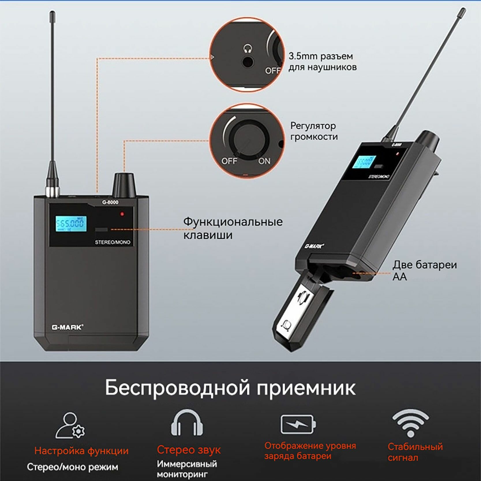 G-MARK G8000 – это профессиональная беспроводная система мониторинга, разработанная для сценических выступлений, репетиций групп и живых трансляций. Система обеспечивает высококачественный стереозвук в режиме реального времени, стабильную передачу аудиосигнала и минимальную задержку, позволяя исполнителям четко слышать свой голос или аккомпанемент.