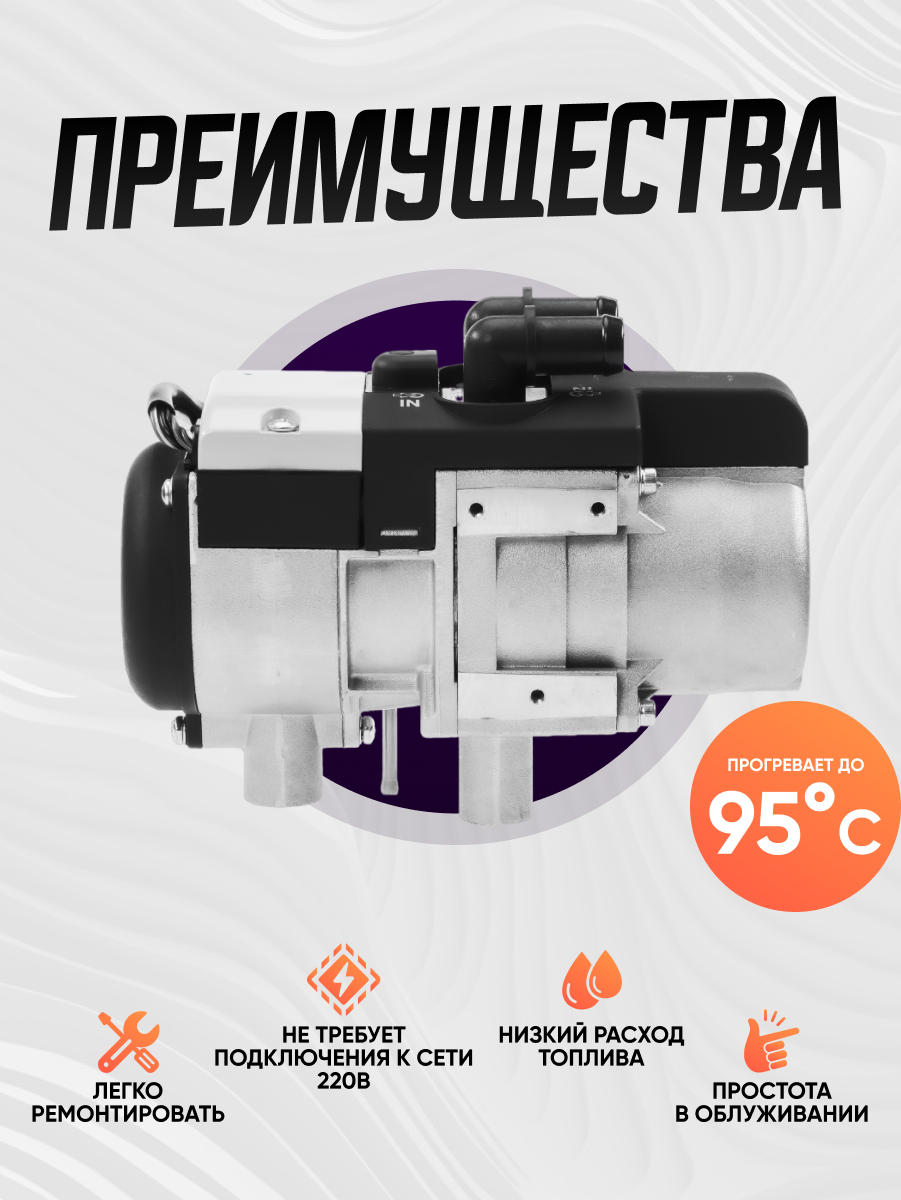 Может обогревать салон автомобиля при выключенном двигателе и предварительно нагревать двигатель, предотвращая его холодный запуск, тем самым продлевая срок службы двигателя