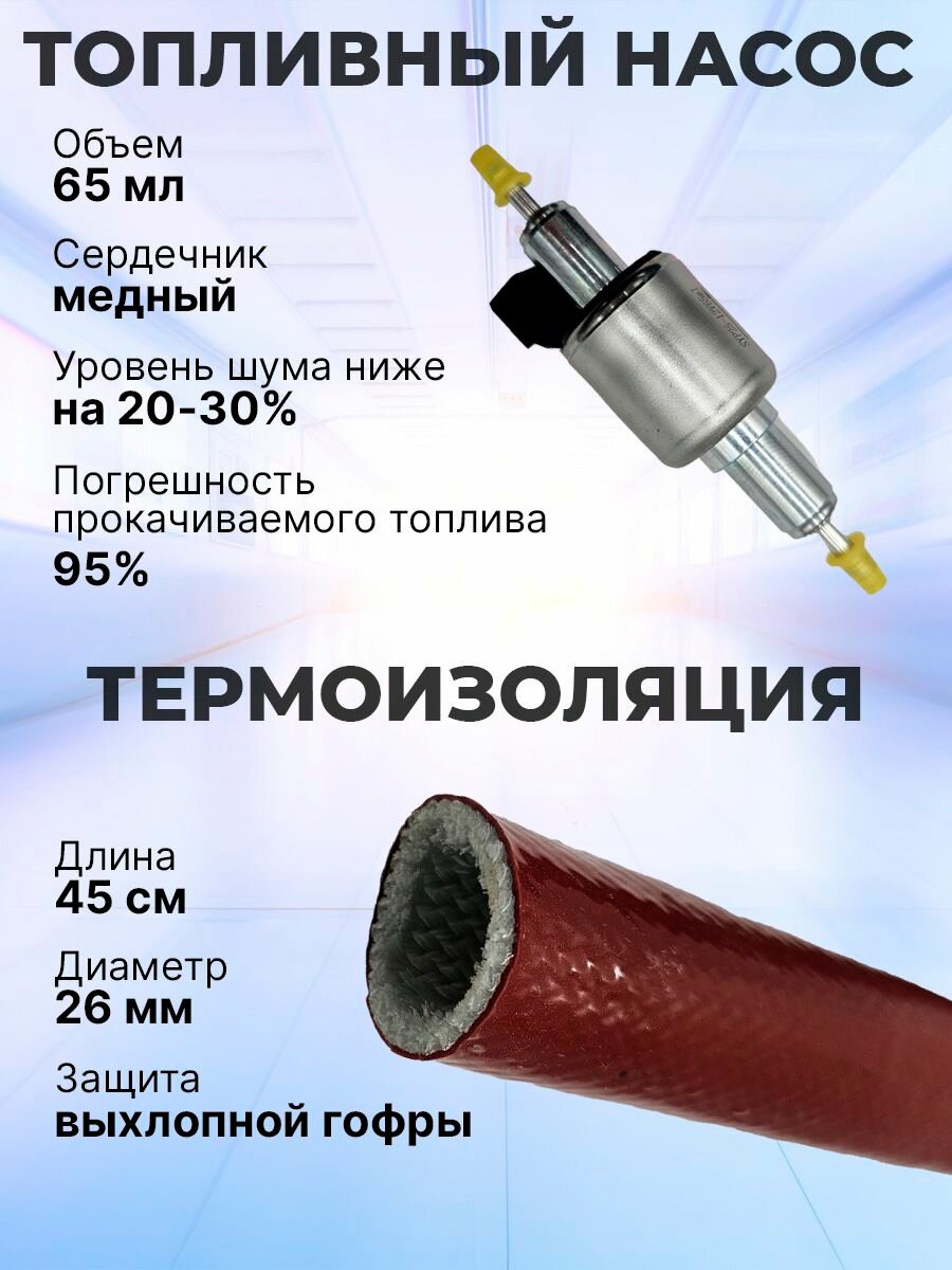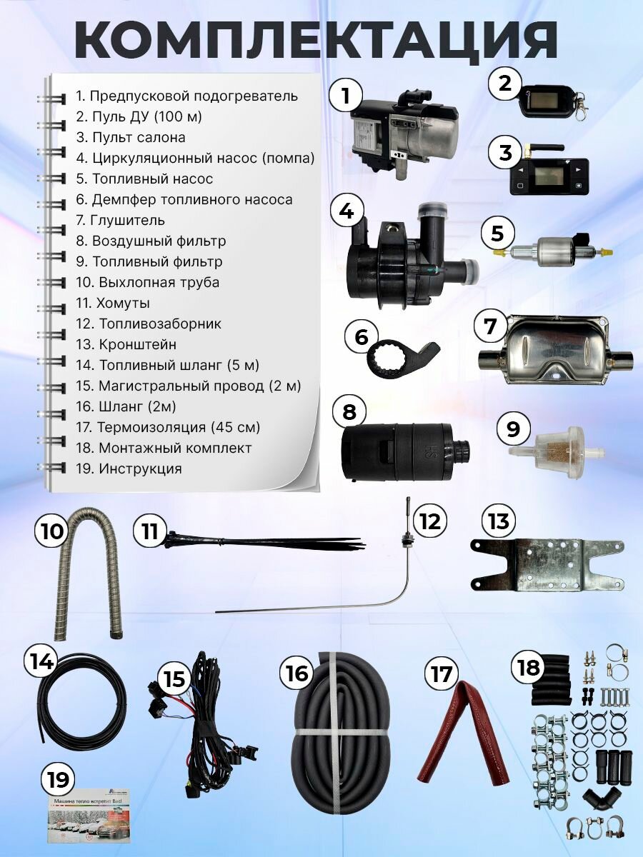 В комплект поставки входят: предпусковой подогреватель, пульт ДУ, салонный пульт, циркуляционный насос (помпа), топливный насос 12В/65 мл, демпфер топливного насоса, глушитель, воздушный фильтр, топливный фильтр, труба выхлопная, хомуты, топливозаборник, кронштейн, топливный шланг длиной 5 метров, магистральный провод длиной 2 метра, шланг длиной 2 метра, термоизоляция длиной 45 см, монтажный комплект, инструкция и гарантийный талон.