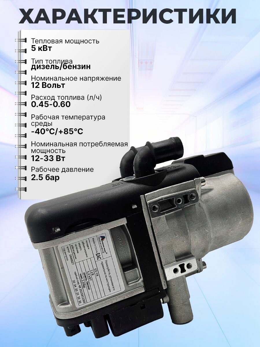 Устройство работает на жидком топливе и имеет мощность 5 кВт, что обеспечивает быстрый и эффективный прогрев двигателя. Потребляемая мощность составляет всего 5000 Вт, что делает его экономичным в использовании.