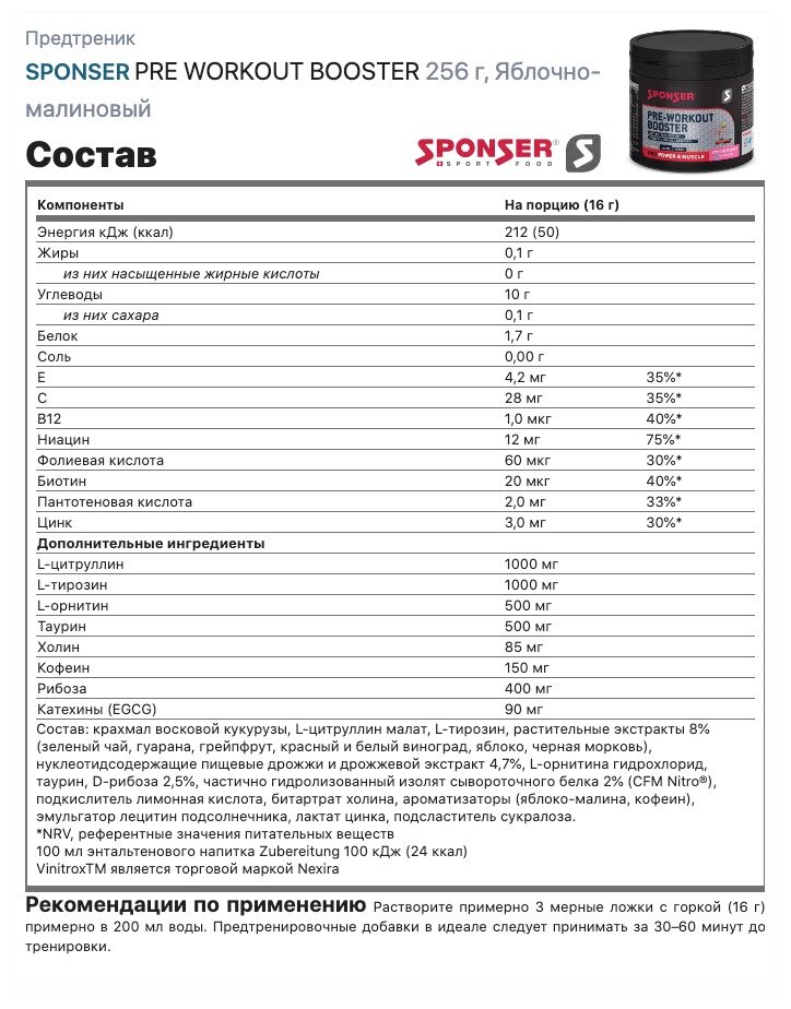 Специалисты фирмы Sponser задумались и создали именно такой продукт - «ПреВоркаут Бустер». Благодаря сложному многокомпонентному составу напитка Ваш организм будет идеально готов к любым физическим нагрузкам.