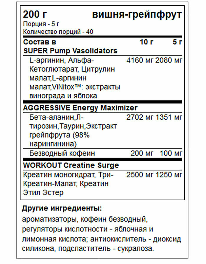 | Основной компонент | BCAA, аргинин, бета-аланин, кофеин, креатин, таурин |