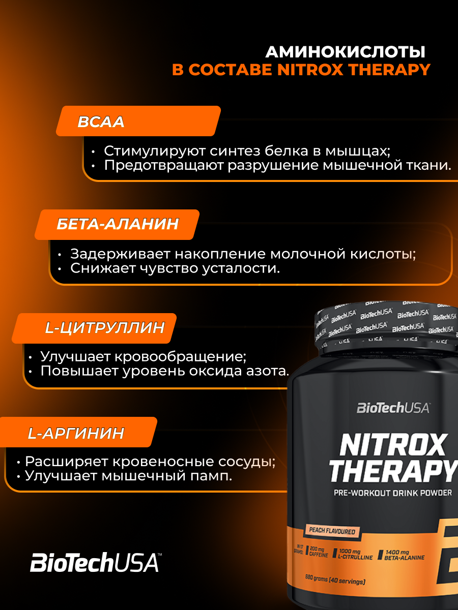 Предтренировочный комплекс / BioTechUSA Nitrox Therapy / 680 гр — персик: сравнение цен, характеристики, фото, актуальное наличие и цены.
