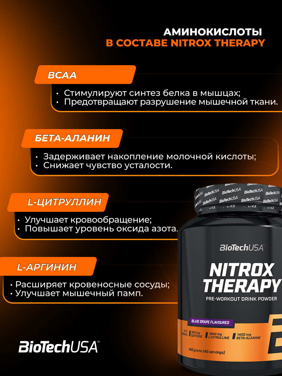 Предтренировочный комплекс / BioTechUSA Nitrox Therapy / 680 гр — голубой виноград: сравнение цен, характеристики, фото, актуальное наличие и цены.