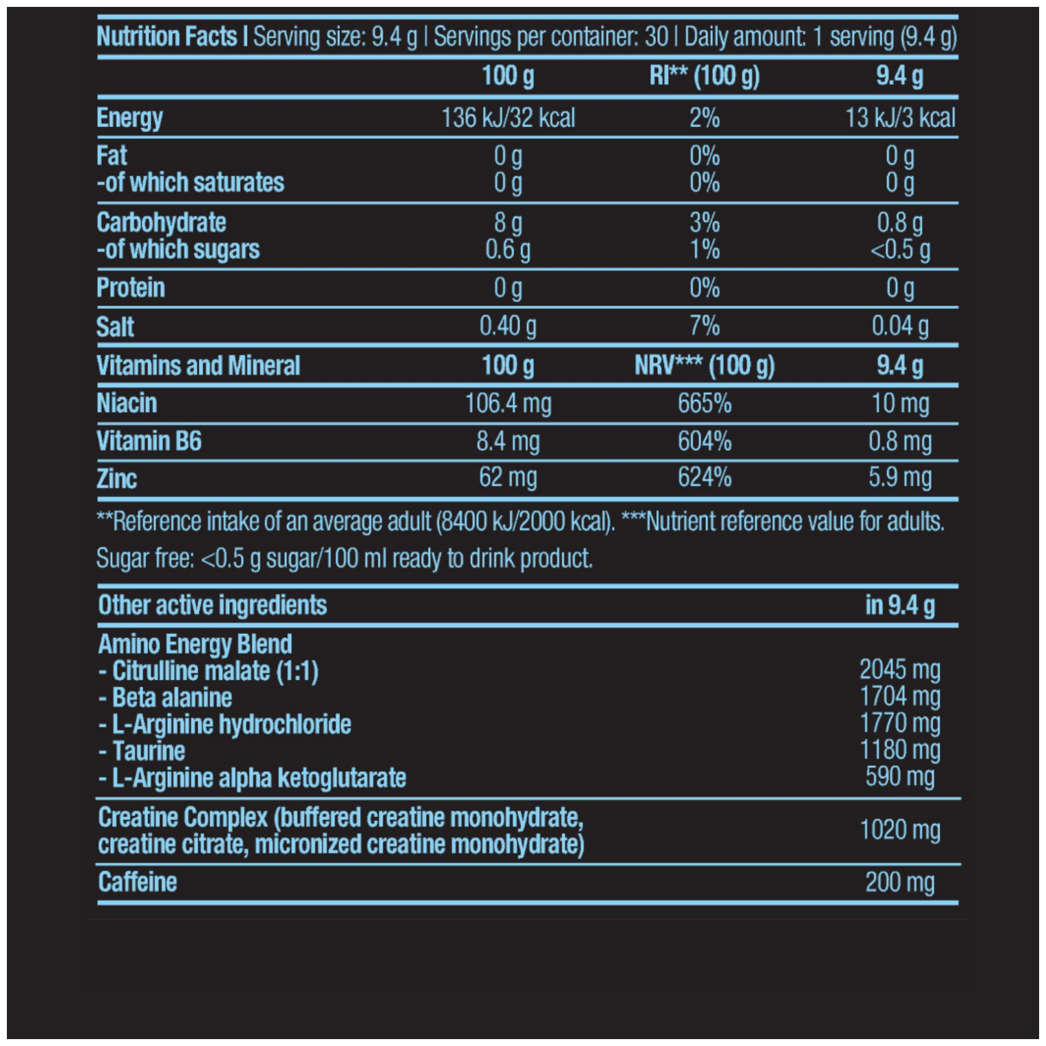 | Дополнительная информация | рекомендации по применению: смешайте одну порцию (17 г = 1 мерная ложка без верха) с 250 мл воды; выпейте одну порцию за 30 минут до тренировки; состав: CARBORADE (декстроза, мальтодекстрин, фруктоза, рибоза), NOx NRG Pump (L-аргинин, кальций альфа кетоглютарат, L-цитруллин, кальций малат, бета ланин, L-аргинин гидрохлорид), лимонная кислота, вещества, предотвращающие слипание (диоксид кремния, кальция фосфат), Multi-Phase Creatine Matrix [CreaBASE (буферный креатин моногидрат), микронизированный креатин моногидрад, креатин цитрат, креатин пируват], ATP Power (кофеин (200 мг), витамин В-3, NADH (никотинамидадениндинуклеотид), альфа липоевая кислотиа, NAC (N-ацетил-цистеин), BCAAs (L-лейцин, L-изолейцин, L-валин), ароматизатор, подсластитель (сукралоза), красители (индиготин, азорубин*). *Может оказать отрицательное влияние на активность и внимание детей. |