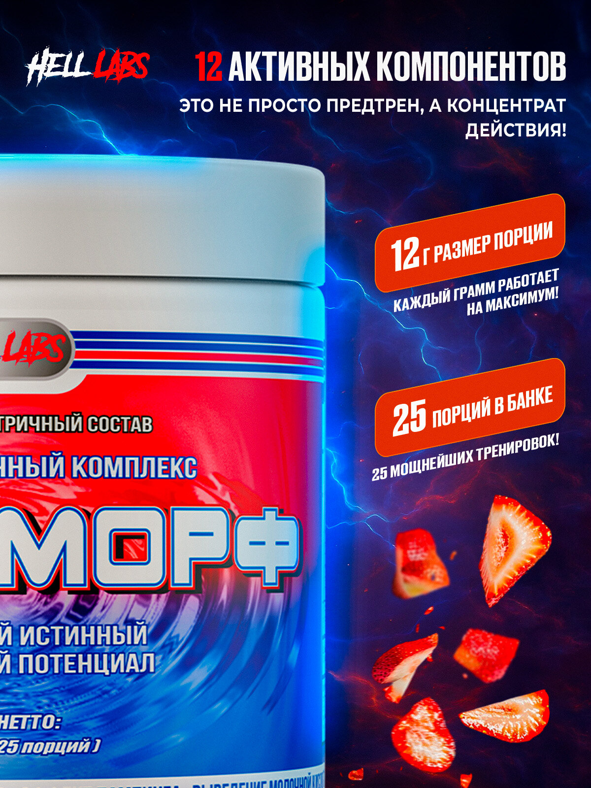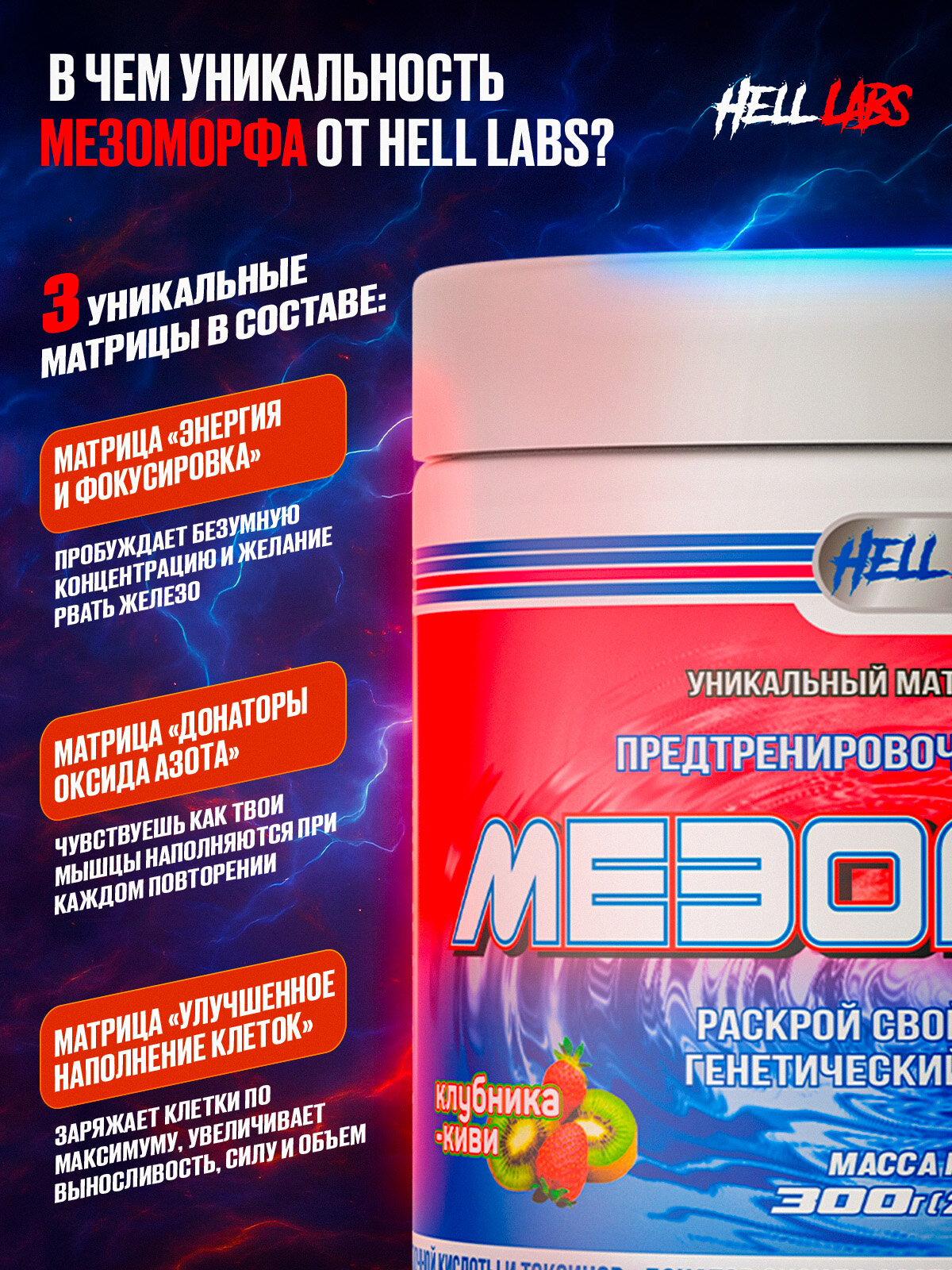 Hell Labs MESOMORPH 300g представлен в виде порошка в банке, с базовыми вкусами клубники и киви. Продукт не содержит аспартам, глютен, лактозу и сукралозу.