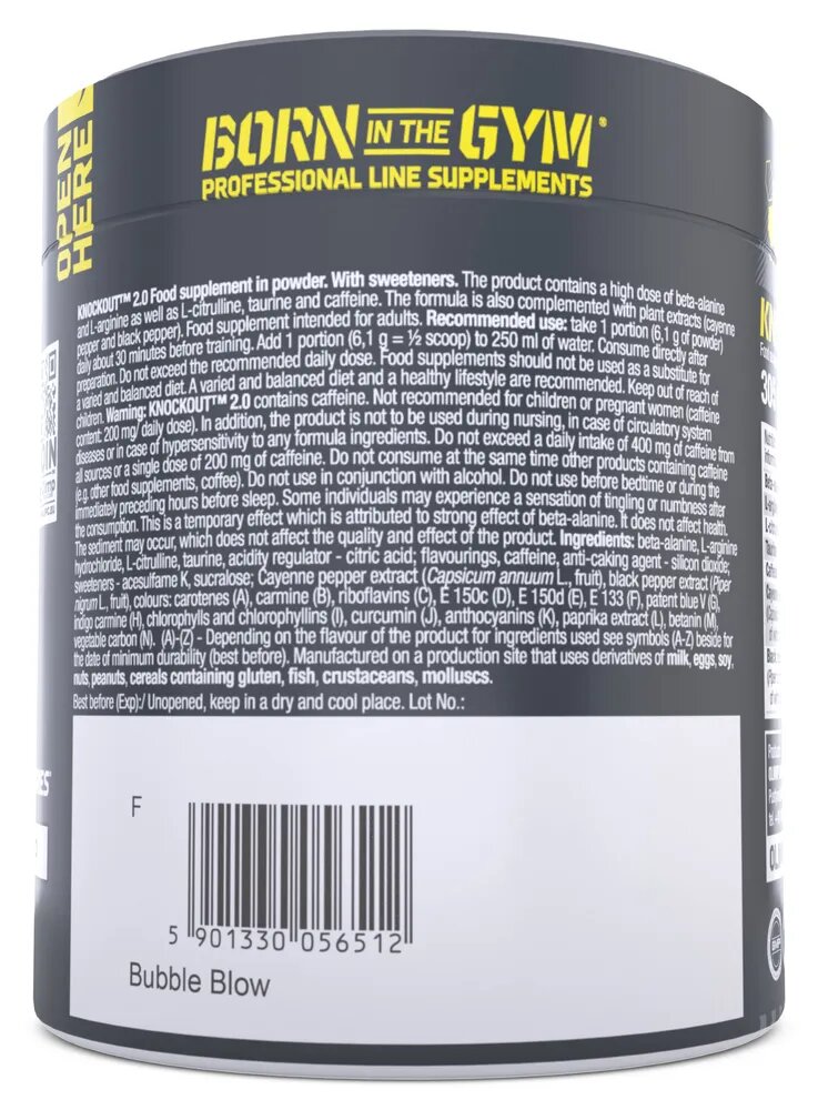 Olimp представляет Knockout 2.0 - один из самых мощных предтренировочников на рынке. Knockout 2.0 имеет в своем составе все необходимое, чтобы провести отличную подготовку. Это новая, улучшенная версия. Добавка содержит бета-аланин, цитруллин, аргинин, таурин, кофеин, экстракты кайенского и черного перцев. Это продукт, который изменит ваши тренировки, перенеся их на качественно новый уровень. Кофеин является одним из наиболее эффективных компонентов. Он повышает производительность, снижает усталость и способствует сжиганию жира. 200 мг кофеина в одной порции существенно увеличит внимание и концентрацию. Комбинация L-аргинина и L-цитруллина дает необыкновенный эффект для взрывного мышечного пампинга. Основные характеристики: сильная стимуляция нервной системы; взрывной мышечный пампинг; 50 полноценных порций. Примите порцию, подождите 15-30 минут и вы ощутите всю мощь предтренировочника Knockout 2.0 от Olimp! Одна порция продукта (½ мерной ложки = 6,1 г) содержит: Бета-аланин 2100 мг L-аргинин 1100 мг L-цитруллин 600 мг Таурин 600 мг Кофеин 200 мг Экстракт кайенского перца (Capsicum annuum L.) 25 мг Капсаицин (8%) 2,0 мг Экстракт черного перца (Piper nigrum L.) 7,5 мг Пиперин (95%) 7,1 мг Ингредиенты: Бета-аланин, L-аргинина гидрохлорид, L-цитруллин, таурин, регулятор кислотности - лимонная кислота, ароматизаторы, кофеин, анти-слеживатель - кремния диоксид, подсластители - ацесульфам К, сукралоза, цикламат (Z); экстракт кайенского перца (Capsicum annuum L, плоды), экстракт черного перца (Piper nigrum L, плоды), красители: каротины (А), кармины (В), рибофлавины (С), Е150с (D), E150d (Е), Е133 (F), синий патентованный V (G), индигокармин (H), хлорофилл и хлорофиллин (I), куркумины (J), антоцианы (К), экстракт паприки (L), бетаин (М), древесный уголь (N). Принимать по одной порции (6,1 г порошка) за 30 минут до тренировки. Смешайте 1 порцию (6,1 г = ½ мерной ложки) с 250 мл воды. Потребляйте непосредственно после приготовления. Не превышайте рекомендуемую дневную дозу.