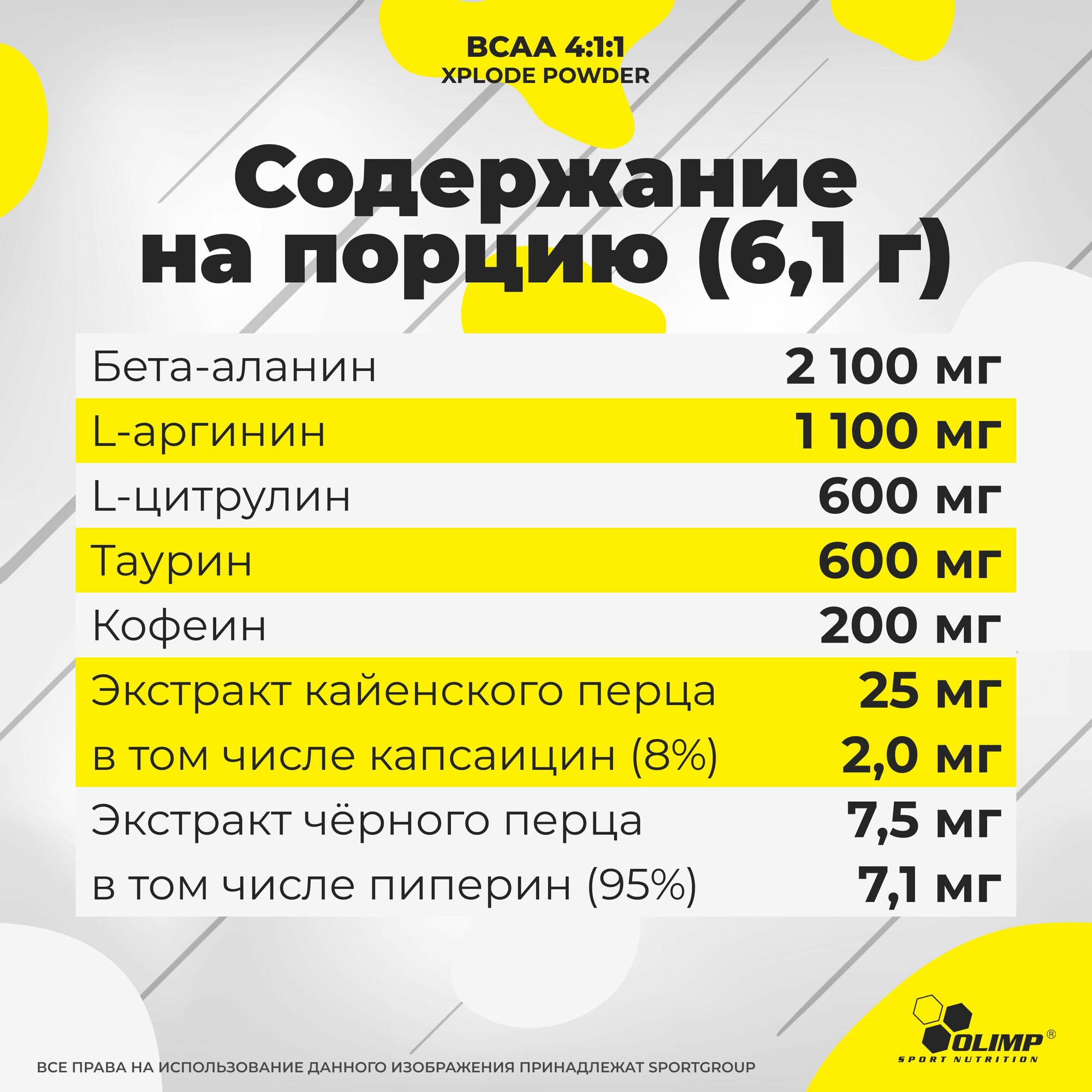 | Дополнительная информация | по одной порции (6,1 г порошка) за 30 минут до тренировки. Смешайте 1 порцию (6,1 г = ½ мерной ложки) с 250 мл воды. Потребляйте непосредственно после приготовления. Не превышайте рекомендуемую дневную дозу; рекомендации по применению: Смешайте 1 порцию (6,1 г = ½ мерной ложки) с 250 мл воды. Сразу после приготовления выпить.; состав: Л-цитруллин, бета-аланин, лимонная кислота, гидрохлорид Л-аргинина, таурин, Л-тирозин, диоксид кремния, ароматизаторы, кофеин, семена гуараны, экстракт ячменя обычного, ацесульфам K, сукралоза, цикламат натрия, экстракт семян кайенского перца, семенной экстракт черного перца, экстракт листьев баранца пильчатого, каротин, кармин, рибофлавин, E150c, E150d , E133, индиго, хлорофилл и хлорофиллин, куркумин, антоциан, экстракт паприки, бетанин, растительный углерод |