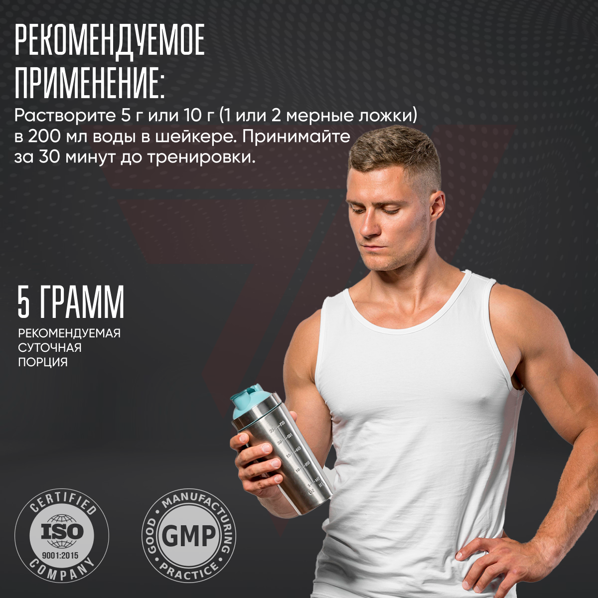 В зависимости от необходимости, интенсивности нагрузки и чувствительности к действию препарата, необходимо растворить от 5 — 15 г концентрата (1 — 3 мерки) в 100 — 200 мл воды, используя для этого шейкер. Препарат следует принимать за 30 мин. до начала тренировки.