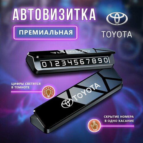 Премиальная парковочная визитка с надписью и логотипом марки авто Toyota(Тойота) — удобный и практичный аксессуар для автомобиля. Такая визитка повысит безопасность вашего авто. Разместив ее в салоне автомобиля на приборной доске, вы можете быть спокойны, в случае возникновения непредвиденных ситуаций, с вами можно оперативно связаться по номеру телефона, оставленному на визитке. Премиальная парковочная визитка Тойота отличается надежностью и долговечностью. Она выполнена из прочного качественного алюминия и глянцевого пластика и прослужит долгие годы. Визитка не выгорает на солнце и не трескается при низких температурах. Табличка для авто имеет удобное многоразовое клейкое крепление, позволяющее быстро и легко закрепить ее на торпеде в салоне, при этом не оставляя следов. В комплекте 6 линеек магнитных цифр, позволяющие составить любой номер телефона. Благодаря специальному покрытию цифры светятся в темноте, поэтому даже глубокой ночью ваш контактный номер телефона будет хорошо виден и читаем. Визитка оснащена механизмом, позволяющим одним движением открыть или скрыть номер телефона. Высокое качество исполнения и стильная упаковка делает автовизитку Toyota роскошным подарком автовладельцу на любые праздники. В нашем магазине вы можете выбрать визитку для следующих марок авто: Mercedes-Benz(Мерседес-Бенц), BMW(БМВ), Audi(Ауди), Cadillac(Кадиллак), Honda(Хонда), Toyota(Тойота), Nissan(Ниссан), Geely(Джили), Haval(Хавал), Chery(Чери), Porsche(Порше), Tesla(Тесла), Mazda(Мазда), Chevrolet(Шевроле), Peugeot(Пежо), Lexus(Лексус), Hyundai(Хундай).