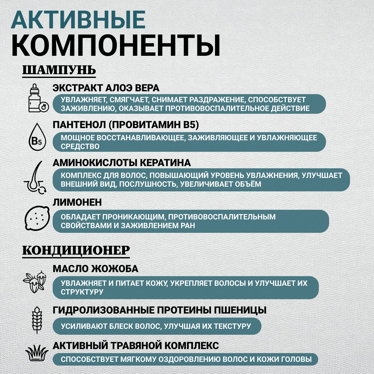 | Состав | Шампунь: Aqua, Ammonium Lauryl Sulfate, Cocamide DEA, PEG-120 Methyl Glucose Dioleate, Aloe Barbadensis (Aloe Vera) Leaf Juice, Cocamidopropyl Betaine, PEG-12 Dimethicone, Keratin Amino Acids, Glycol Stearate, Panthenol, Parfum, Citric Acid, Guar Hydroxypropyltrimonium Chloride, Stearamide AMP, Benzyl Alcohol, Limonene, Potassium Sorbate, Magnesium Nitrate, Methylchloroisothiazolinone, Magnesium Chloride, Methylisothiazolinone. Кондиционер: Aqua, Cetearyl Alcohol, Distearyldimonium Chloride, Cetyl Acetate, Oleyl Acetate, Acetylated Lanolin Alcohol, PEG-20 Stearate, Glycerin, Parfum, PEG-20 Sorbitan Isostearate, Triticum Vulgare (Wheatgerm) Germ Oil, Cetrimonium Bromide, Simmondsia Chinensis (Jojoba) Oil, Propylene Glycol, Benzyl Alcohol, BHT, Limonene, Hydrolysed Wheat Protein, Chamomilla Recutita (Chamomile) Flower Extract, Sorbitol, Linalool, Magnesium Nitrate, Methylchloroisothiazolinone, Centaurea Cyanus (Cornflower) Flower Extract, Methylparaben, Tussilago Farfara (Coltsfoot) Leaf Extract, Tanacetum Vulgare (Tansy) Extract, Magnesium Chloride, Methylisothizlinone |