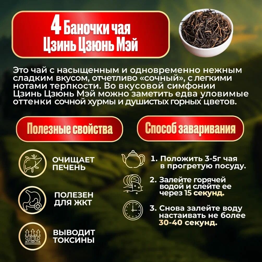 4 баночки (оранжевого цвета) по 15 г. чая сорта Цзинь Цзюнь Мэй родом из провинции Фуцзянь. В переводе означает «Золотые Брови», этот чай появился на свет по чайным меркам не так давно, всего лишь в 2005 г, сразу же завоевал сердца любителей чая в Китае и постепенно освоил другие страны. Аромат цветочно-пряный, с проблесками медовых, мускатных, бисквитных и смородиновых оттенков. Вкус мягкий, очень чистый, плотный, чуть вяжущий, с проблесками цитруса и гречишного мёда и яркой бархатистой нотой характерной для Цзинь Цзюнь Мэй. Имеет приятное, продолжительное послевкусие. Прекрасный повседневный напиток.
