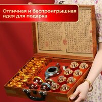 Три сорта чая и сервиз упакованы в подарочный кейс премиального качества из натурального дерева, который украшен изящной тисненной табличкой с изображением драконов, что делает его очень уместным подарком в наступающий 2024-ый год деревянного дракона.