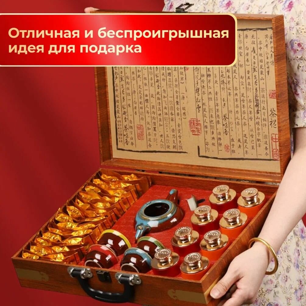 Красивейший и солидный набор ассорти листового китайского чая и сервиза для чайной церемонии - отличная и беспроигрышная идея для подарка как друзьям, так и коллегам, а также врачу, учителю, воспитателю, любому значимому человеку. Повод также может быть любой, будь то Новый год, 8 марта, профессиональный праздник, новоселье.