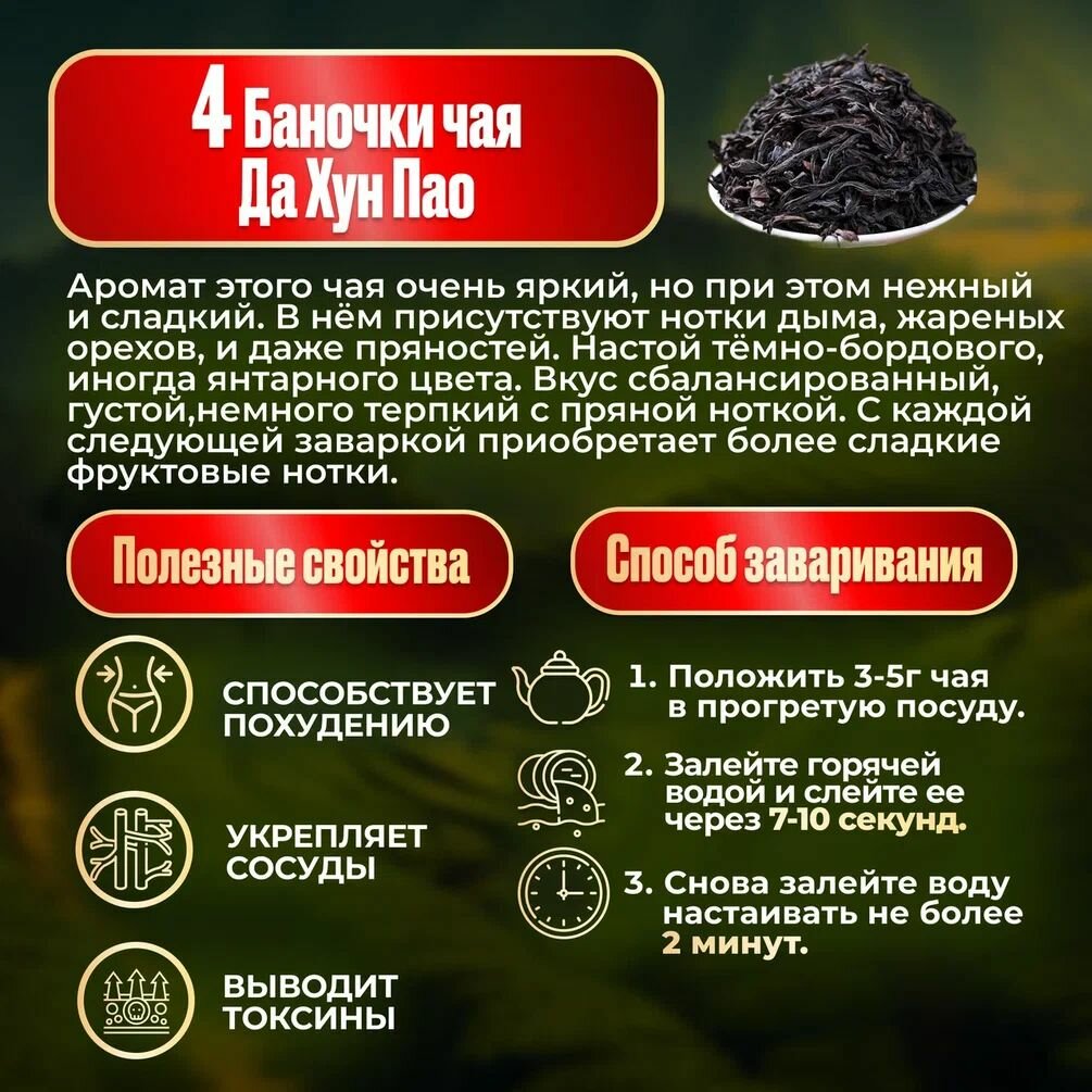 4 баночки (красного цвета) по 10 г. чая сорта Да Хун Пао, что в переводе с китайского означает "Большой Красный Халат". Это утёсный чай, который производят на северо-западе провинции Фуцзянь, в горах Уи. По классу его относят к улунам средней ферментации или полуферментированным улунам. По цвету высушенного листа чай бурый с бордовым и зелёным оттенками, имеет насыщенный, со сладким привкусом, вкус. При последующих заварках вкус, цвет и аромат чая изменяются: вначале насыщенный, с элементом терпкости, затем в нём проявляются более легкие, фруктовые оттенки. Цвет чайного настоя от тёмно-золотистого до насыщенно-янтарного.