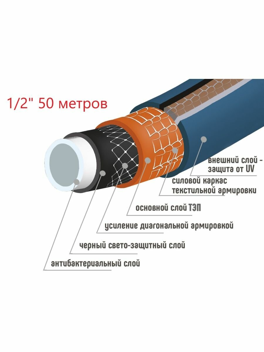 2 слоя усиленной армировки (диагональное и текстильное). Пищевой. Срок службы 20 лет. Антибактериальный. Не образуются водоросли внутри, нет гниения, нет вредных бактерий. Идеально держит форму. Не скручивается не перегибается. Устойчив к ультрафиолету. С годами эксплуатации шланг не изменяется и выглядит как новый. Прочное покрытие SOFT TOUCH , бархатистое на ощупь . Шланг отлично скользит по любой поверхности