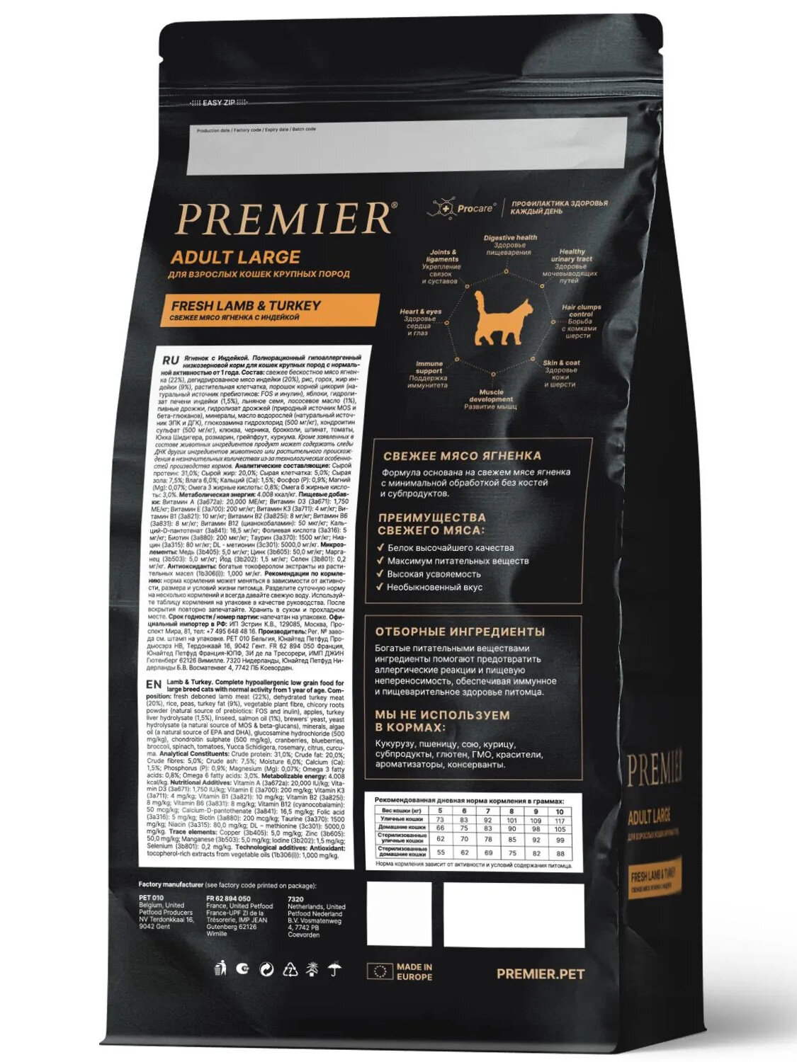 Состав: свежее бескостное мясо ягненка (22%), дегидрированное мясо индейки (20%), рис, горох, жир индейки (9%), растительная клетчатка, порошок корней цикория (натуральный источник пребиотиков: FOS и инулин), яблоки, гидролизат печени индейки (1,5%), льняное семя, лососевое масло (1%), пивные дрожжи, гидролизат дрожжей (природный источник MOS и бета-глюканов), минералы, масло водорослей (натуральный источник ЭПК и ДГК), глюкозамина гидрохлорид (500 мг/кг), хондроитин сульфат (500 мг/кг), клюква, черника, брокколи, шпинат, томаты, Юкка Шидигера, розмарин, грейпфрут, куркума.