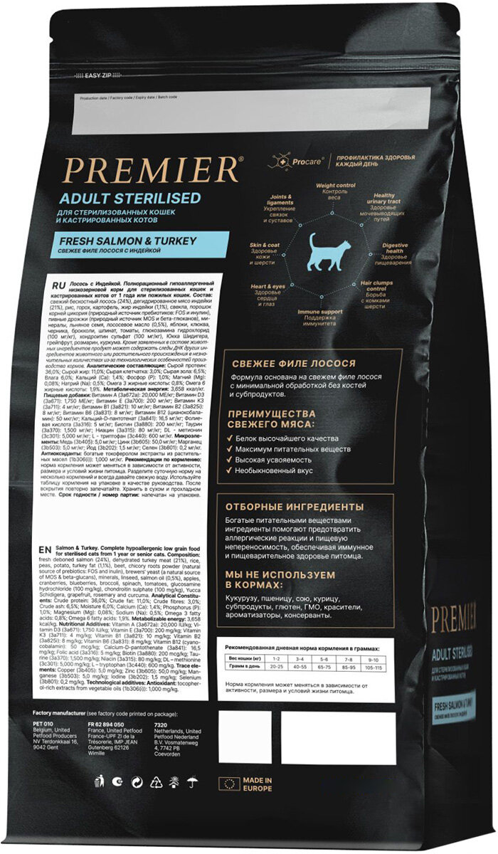 | Особые потребности | беззерновой, гипоаллергенный, для беременных / кормящих кошек, для вывода шерсти, для живущих в помещении, для живущих на улице, для здоровья кожи и блеска шерсти, для здоровья костей и суставов, для определенных пород, для стерилизованных/кастрированных, при чувствительном пищеварении, профилактика МКБ, профилактика зубного камня, профилактика избыточного веса |