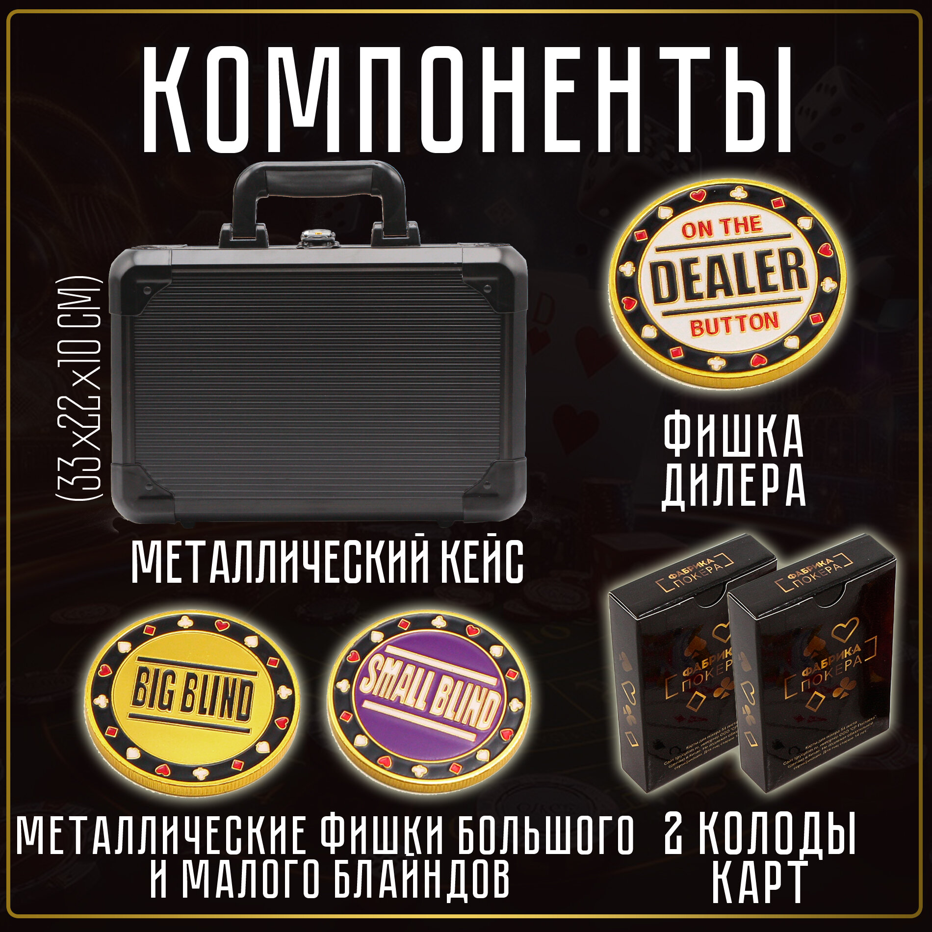 - Металлические фишки блайндов и дилера