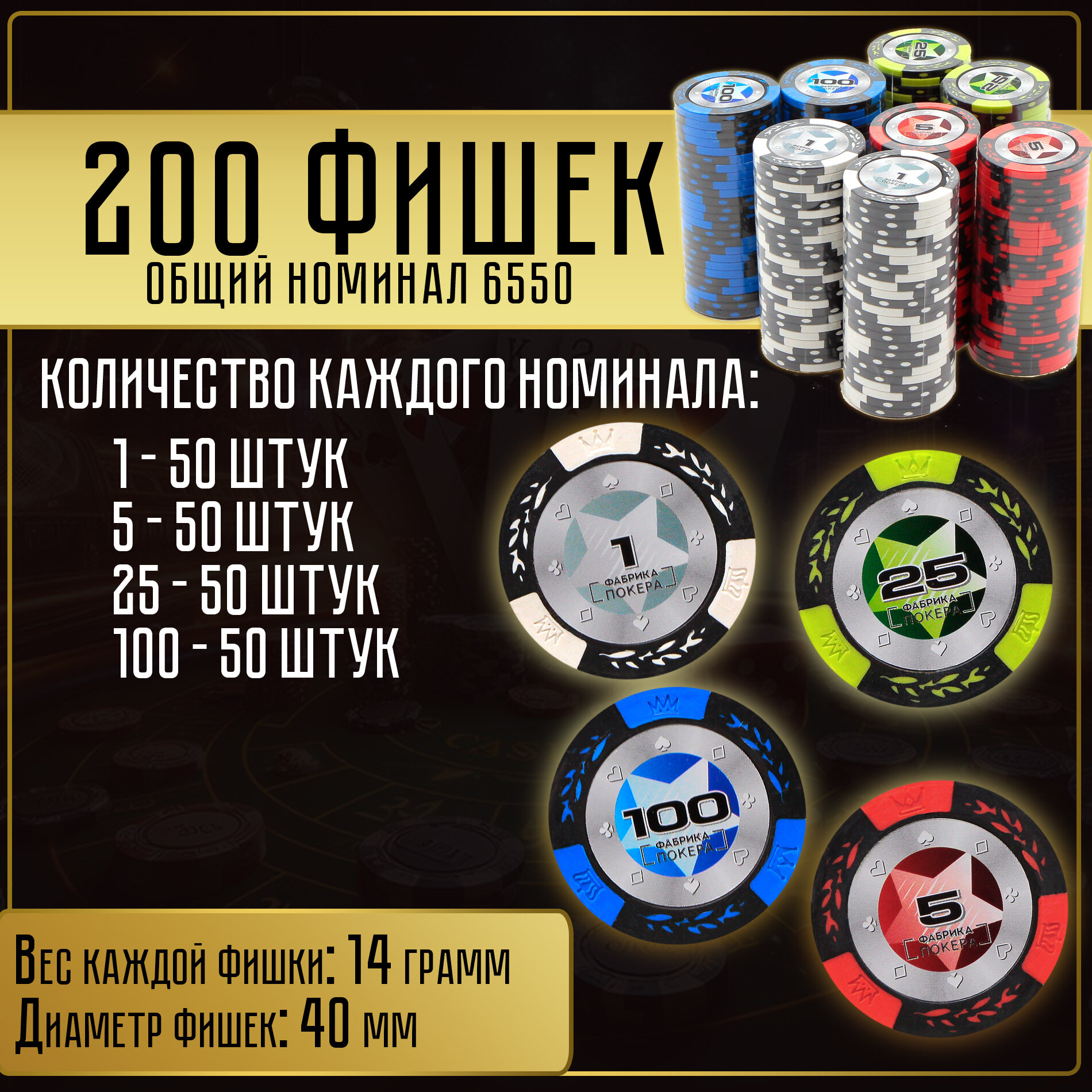 Общая сумма номиналов фишек - 6550.