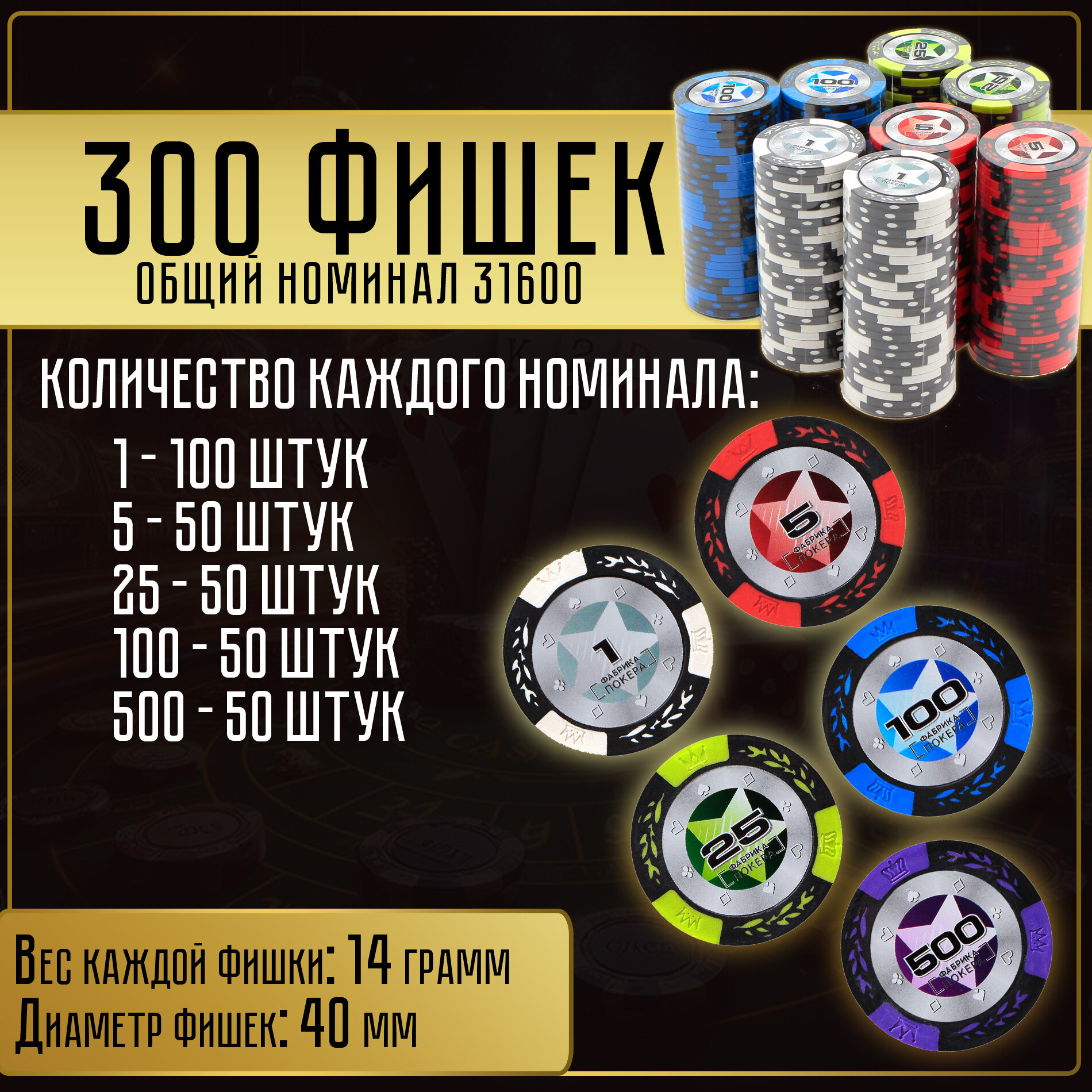 - 300 фишек с номиналом 1, 5, 25, 100, 500