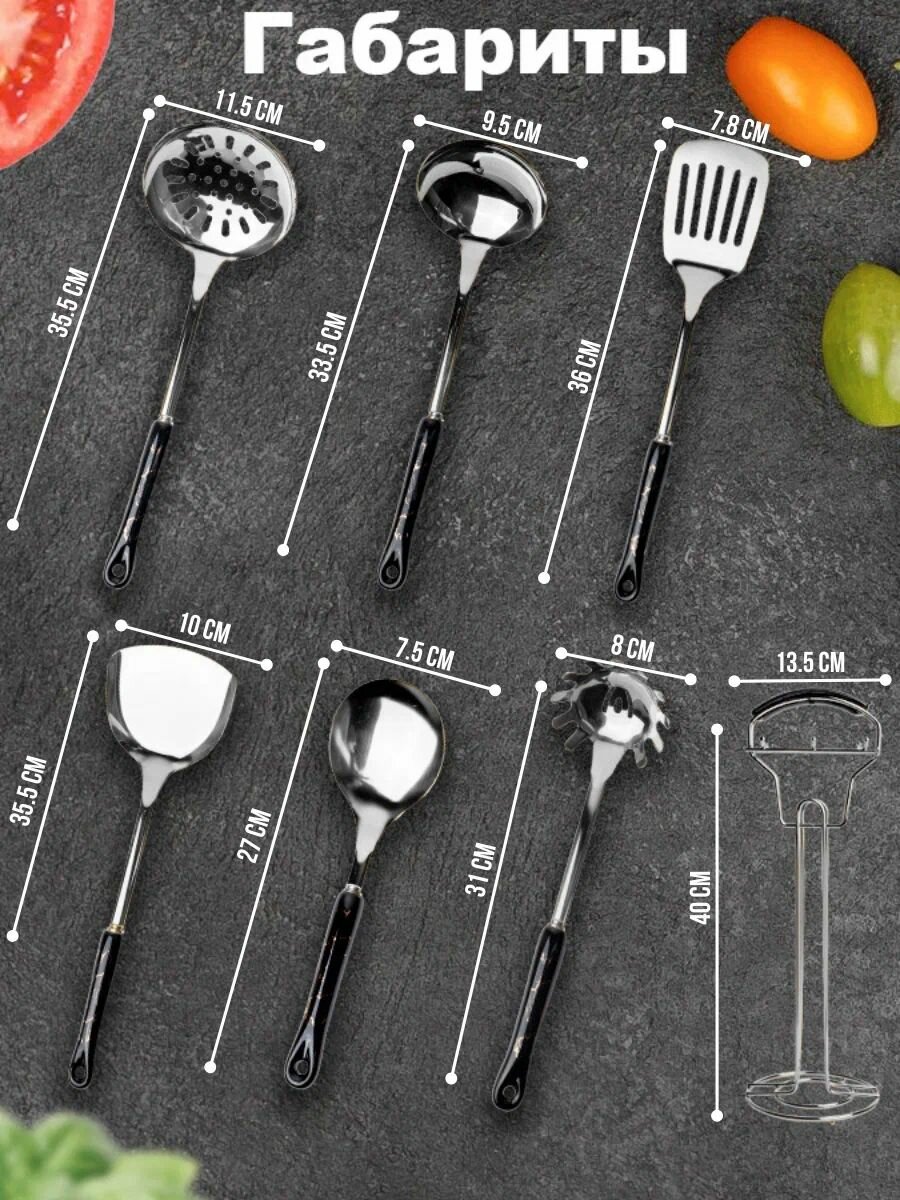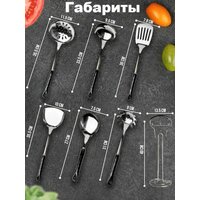 1.Лопатка 2.Половник 3.Ложка для спагетти 4.Лопатка для жарки 5.Ложка для вторых 6.Шумовка 7. Подставка