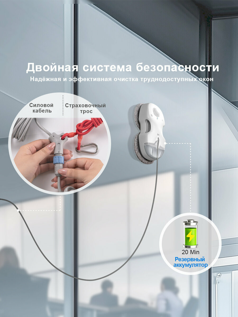 автоматическая остановка, мойка безрамных поверхностей, обход препятствий, светодиодная индикация
