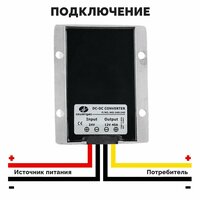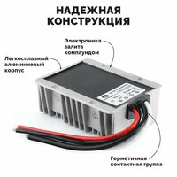 Преобразователь в защищенном корпусе конвертирует напряжение номиналом 24 Вольта в 12 Вольт с максимальным током на выходе 20А. Позволяет устанавливать на грузовые автомобили оборудование, рассчитанное на электросети легковых. Особенности: Входное напряжение в диапазоне 16-40 Вольт Литой металлический корпус с ребрами охлаждения Все компоненты залиты компаундом для 100% герметичности Нагрузка до 480 Вт на выходе Кронштейны для монтажа на болты Характеристики: Номинальное напряжение: 24 Вольта Выходящее напряжение: 12 Вольт Диапазон входящего напряжения: 16-40 Вольт Эффективность преобразования: > 94% Выходной ток: 40A Выходная номинальная мощность: 480W Рабочая температура: от -35℃ до +80℃ Защита от перегрузки по току: есть Защита от перенапряжения: есть Защита от перегрева: есть Защита от короткого замыкания: есть Класс пыле- влагозащиты: ip67 Метод охлаждения: корпус из литого алюминия для естественного отвода тепла