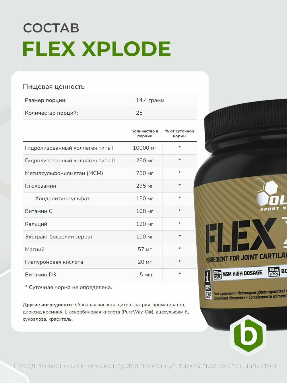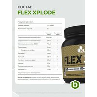 Формула Flex Xplode включает разные типы коллагена, МСМ, глюкозамин сульфат, хондроитин сульфат, экстракт босвеллии, витамины С и Д3, кальций и магний, гиалуроновую кислоту.