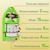 Усилие 2 тонны. По сравнению с винтовым прессом работать легко, справится даже ребенок. Пресс отжимает до 100%, мезга остается полностью сухая. Прочная монолитная конструкция с профессиональным рычажным домкратом лишена недостатков. Усилие домкрата таково, что он легко поднимает крупный внедорожник.