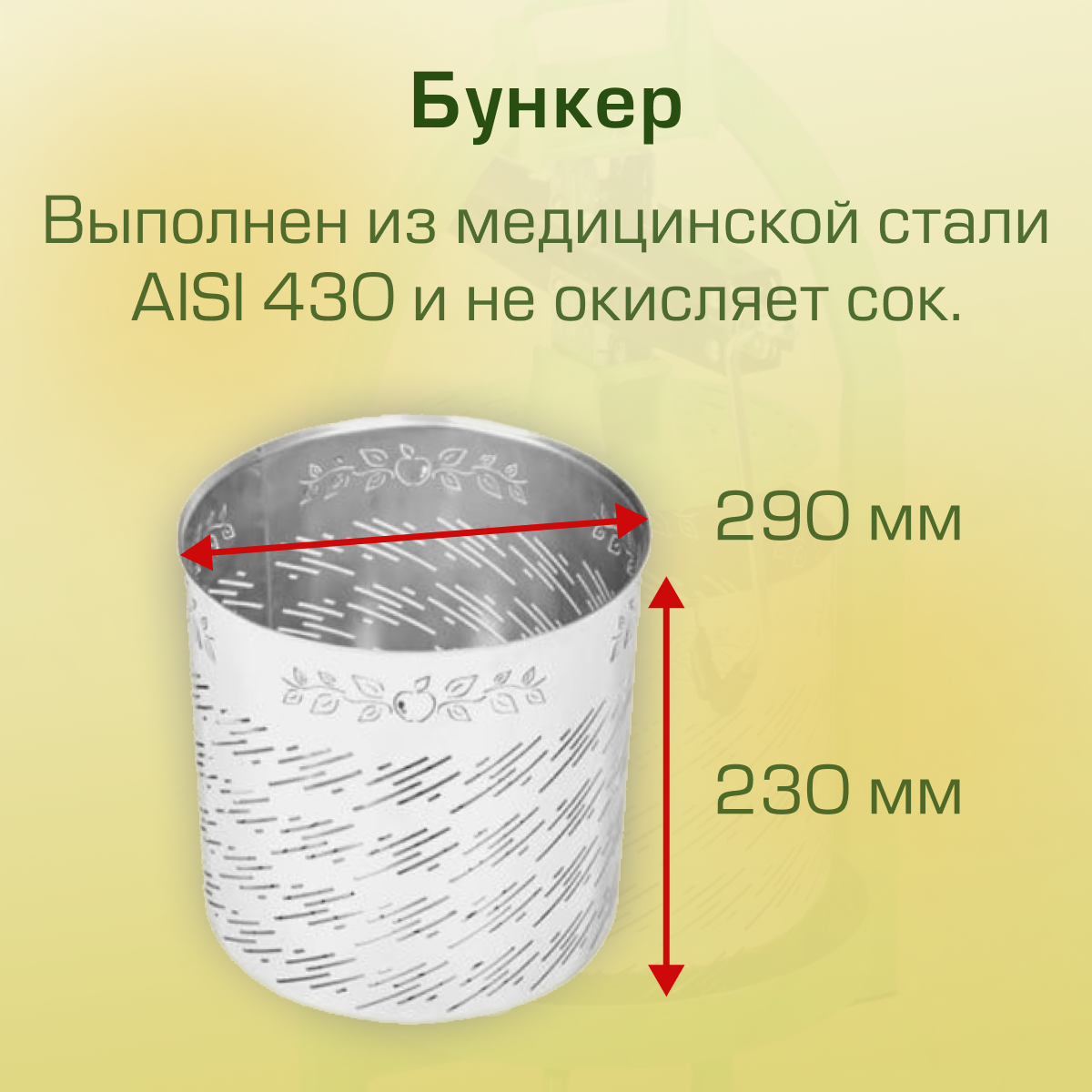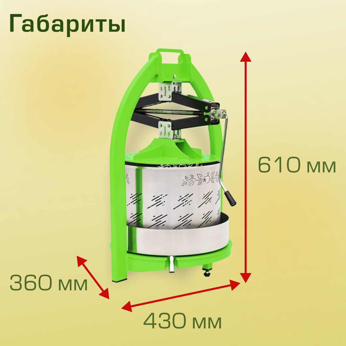 Соковыжималка механическая SOK NEW 15л (пресс домкратный, пресс для отжима, ручная соковыжималка) для винограда и фруктов - это мощная домкратная система, создающая давление, эквивалентное 2 тоннам. При таком усилии сок из фруктов, ягод и овощей отжимается практически полностью, а мезга выходит сухой. Пресс производится из нержавеющей стали толщиной 4 мм. Отдельные детали, выдерживающие максимальную нагрузку, - производят из усиленной 6-миллиметровой нержавейки. Все детали из углеродистой стали покрыты спец краской Pantone 374 C не вступающей в реакцию с соком. Прессы производятся на современной технологической линии и проходят контроль службы ОТК.