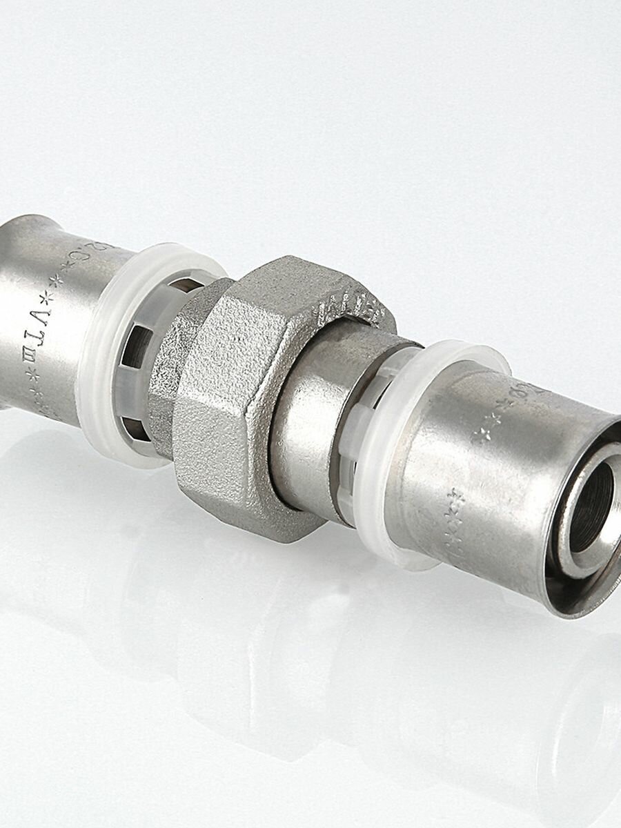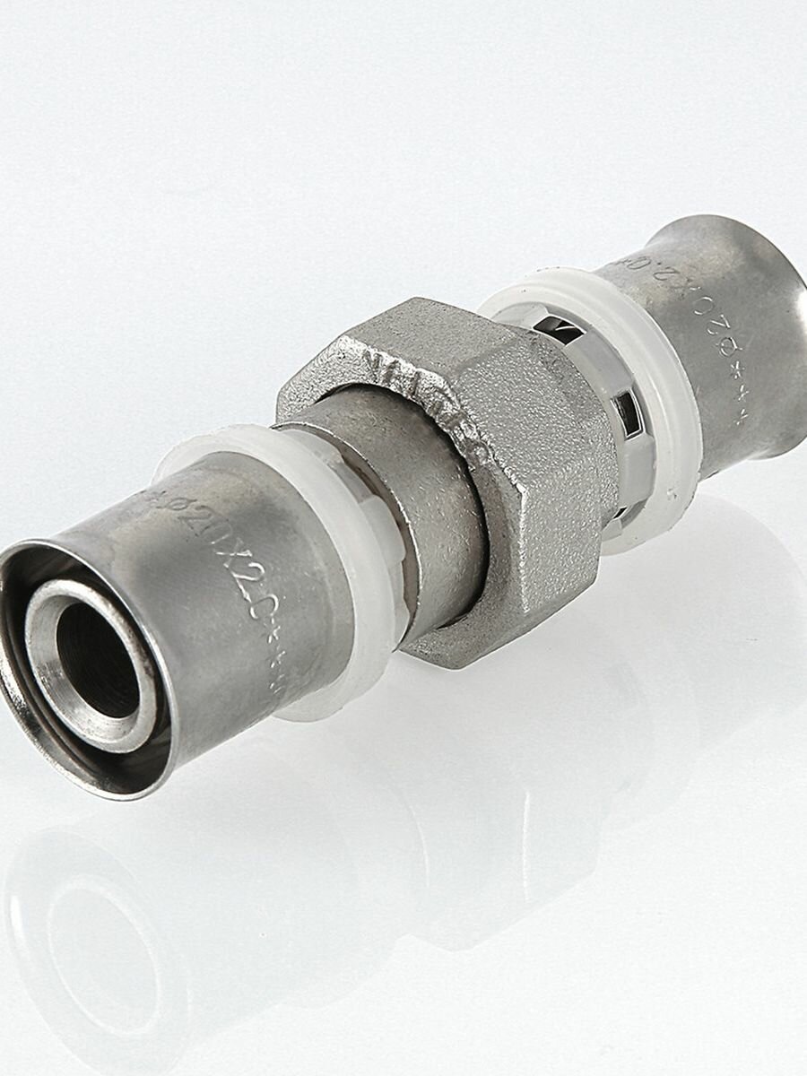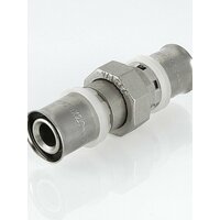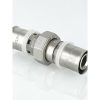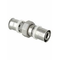 Прямой равнопроходной пресс-фитинг для создания разъемного соединения на трубопроводе из металлополимерных труб (металлопластиковых труб) или труб из сшитого полиэтилена. Состоит из двух пресс-деталей: с переходом на наружную резьбу и с накидной гайкой. Стандарт их соединения – "евроконус".