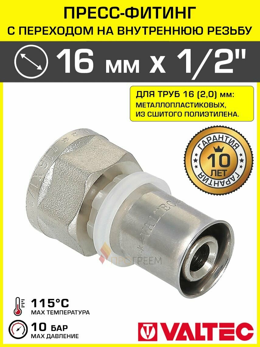 Пресс-фитинг VALTEC 16 мм с переходом на вн. р. 1/2″ прямой 16(2,0), арт. VTm.202. N.001604: сравнение цен, характеристики, фото, актуальное наличие и цены.