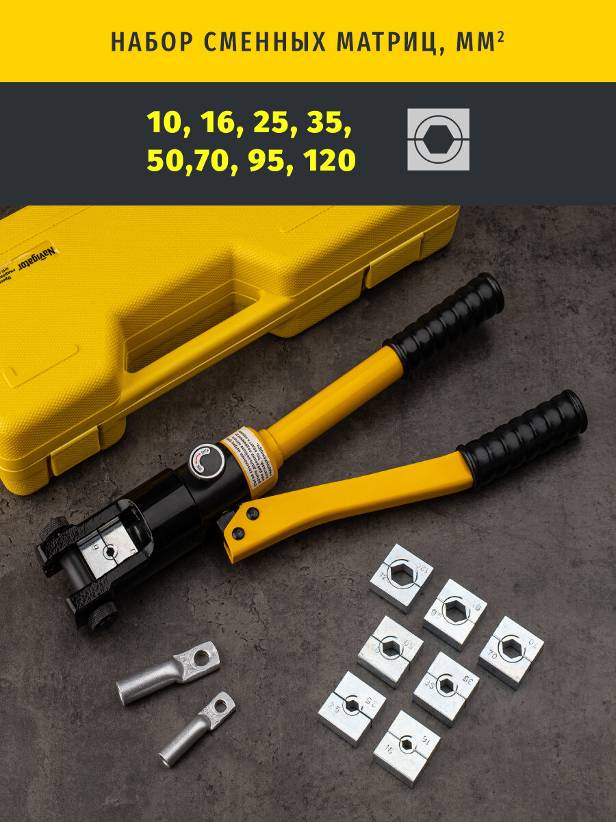 Гидравлические ручные прессы Navigator серии NHT-Pg01 используются для опрессовывания неизолированных медных, алюминиевых, алюмомедных силовых наконечников и гильз