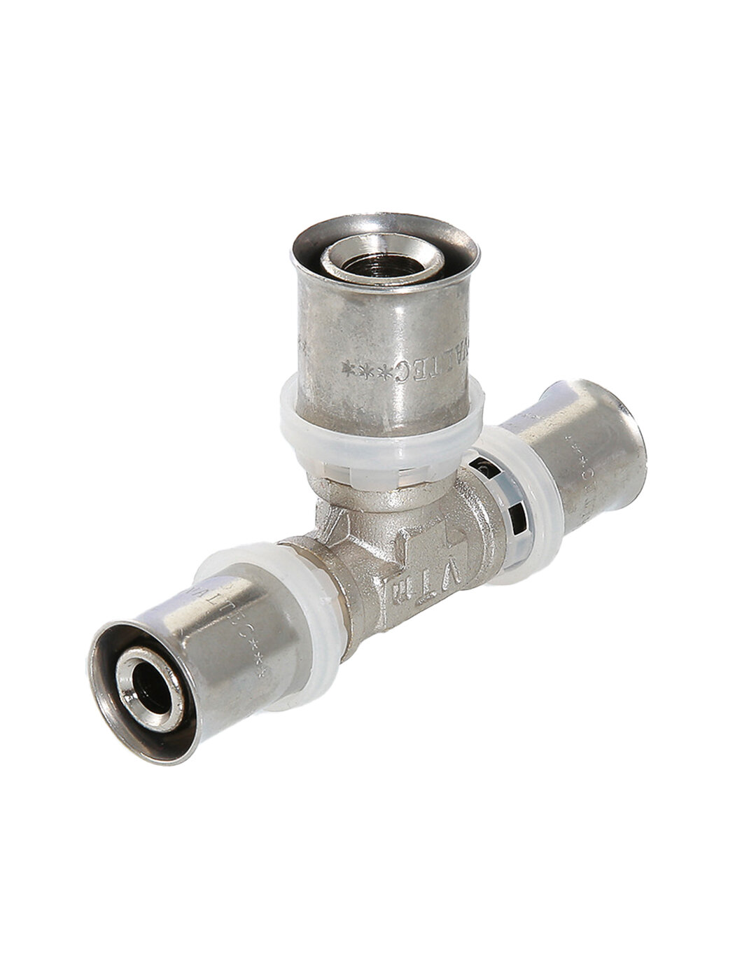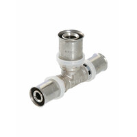 (VTm.231. N) Пресс-фитинг – тройник предназначен для соединения трех труб – металлопластиковых либо из сшитого полиэтилена. Корпус выполнен из сантехнической латуни марки CW617N, уплотнительные кольца штуцеров – из EPDM плотностью 1,22 г/см3, пресс-гильзы – из нержавеющей стали. Нейлоновая обойма выполняет функции фиксатора гильзы, направляющей для пресс-насадок и диэлектрической прокладки, прерывающей контакт между алюминием трубы и латунью корпуса. Конструкция пресс-фитингов VALTEC обеспечивает повышенную пропускную способность, надежность соединений, прочность и термостойкость. Монтаж фитинга производится пресс-инструментом с насадкой «ТН». Типоряд содержит равнопроходные и переходные пресс-тройники.