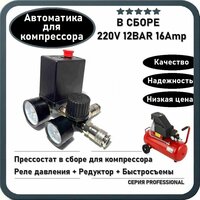 Купить Прессостат / Реле давления + Редуктор в сборе для компрессора 220Вт 16Амп 12Bar (быстросъемы) с доставкой по всей России.
