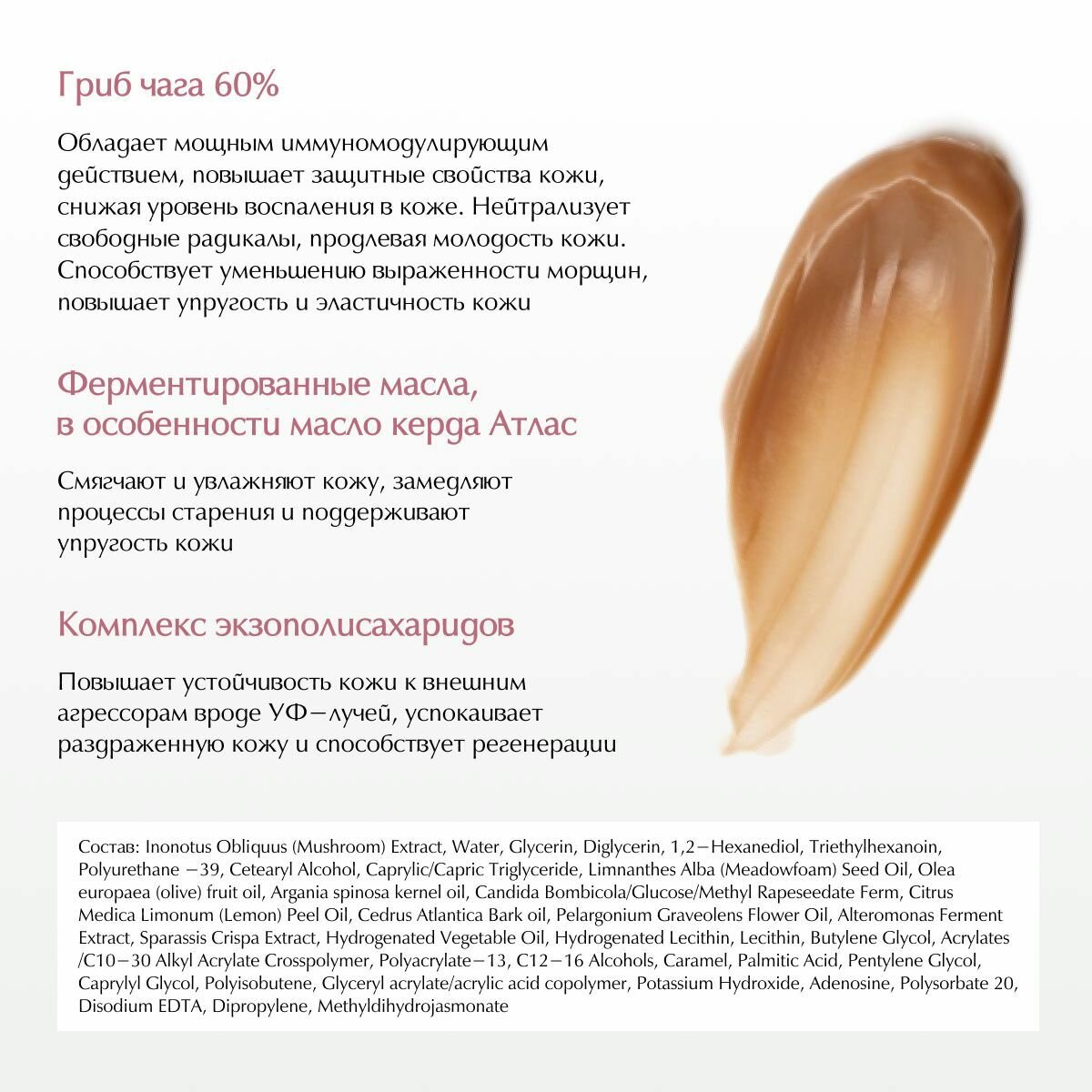 Средство содержит высокую концентрацию экстракта гриба чага, оказывает ярко выраженное омолаживающее и восстанавливающее действие, улучшает цвет лица и повышает иммунитет кожи, поддерживая её молодость, упругость и эластичность.