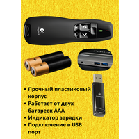 Это презентер USB, который состоит из пульта и приемника, подключаемого в порт USB. Он не требует установки драйверов и работает по принципу plug and play, что позволяет быстро и легко начать использовать его. Logitech - это известный бренд презентеров, который славится высоким качеством своих устройств.