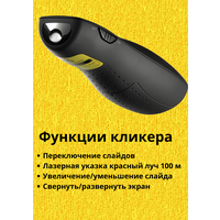 Это презентер с пультом для презентаций, который удобно держать в руке благодаря эргономичной форме. Он работает от 2 батареек типа AAA и имеет дальность связи до 20 метров.
