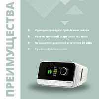 - Функция E-COMP: помогает пациентам постепенно адаптироваться к целевому давлению, увеличивая его шагами по 1 см H2O в день, начиная с 50% от необходимого лечебного давления.